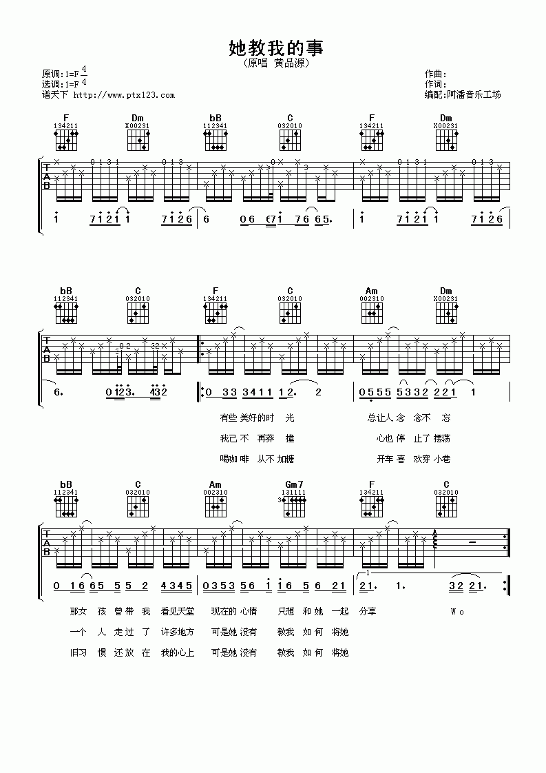 曲谱介绍: 她教我的事吉他六线谱,她教我的事吉他谱,原调F。