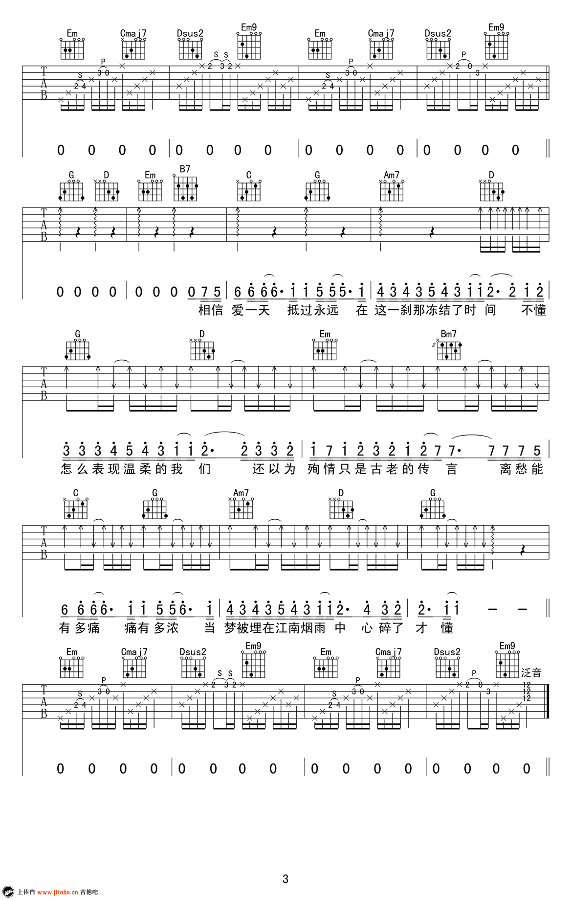 曲谱介绍: 林俊杰《江南》吉他弹唱谱,采用G调指法编配,共有3张高清图谱。