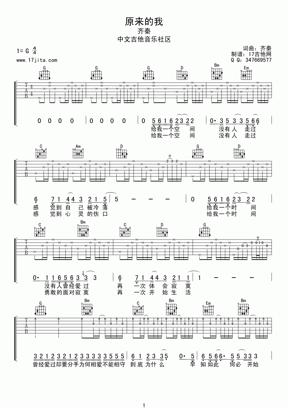 原来的我吉他谱 - 齐秦 - G调吉他弹唱谱