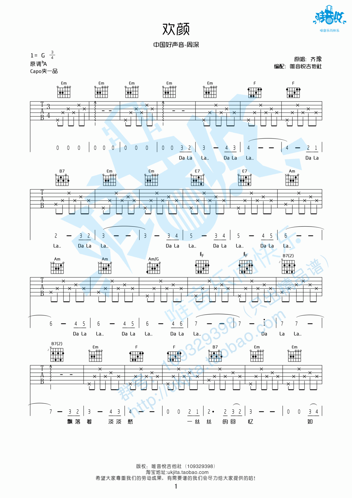 曲谱介绍: 中国好声音周深《中国好声音周深欢颜原版》吉他弹唱谱,采用G调指法编配原版,共有3张高清图谱。