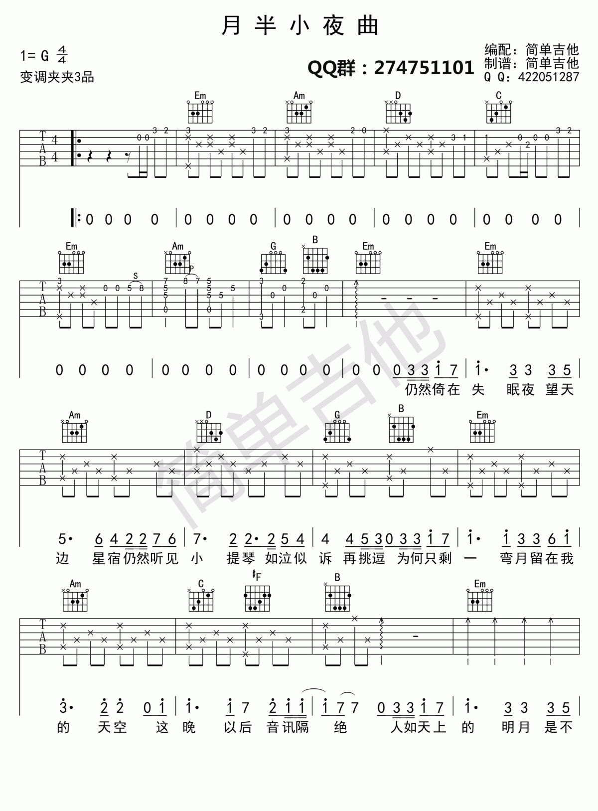 曲谱介绍: 李克勤《月半小夜曲》吉他弹唱谱,采用G调指法编配,共有3张高清图谱。