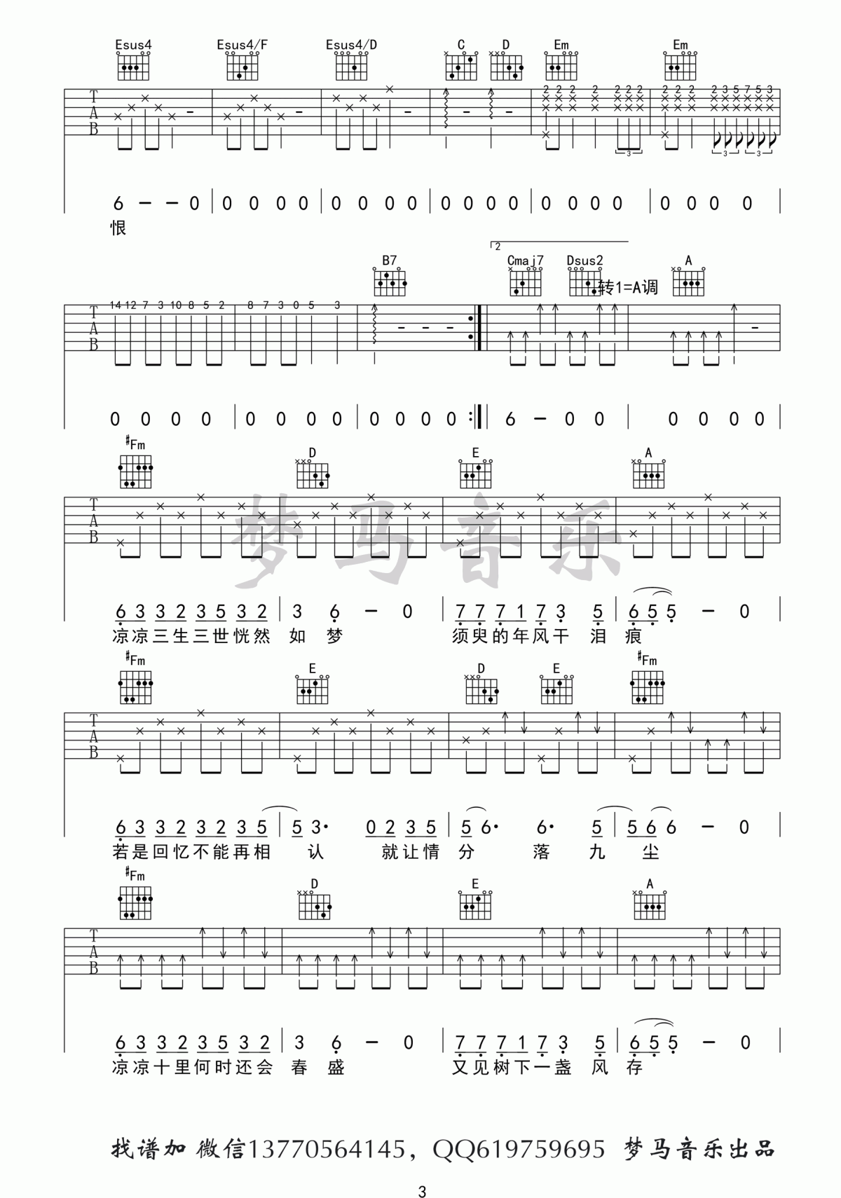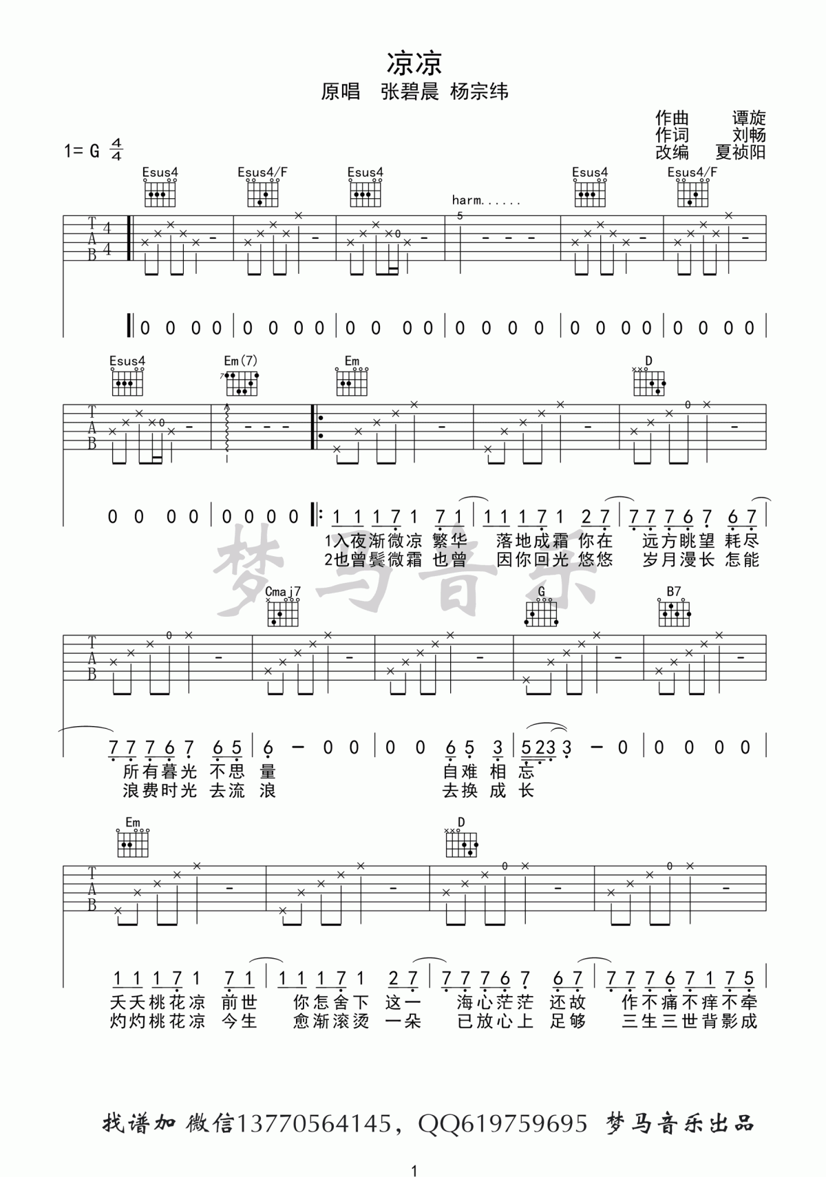 曲谱介绍: 张碧晨&杨宗纬《凉凉》吉他弹唱谱,采用G调指法编配,共有4张高清图谱。