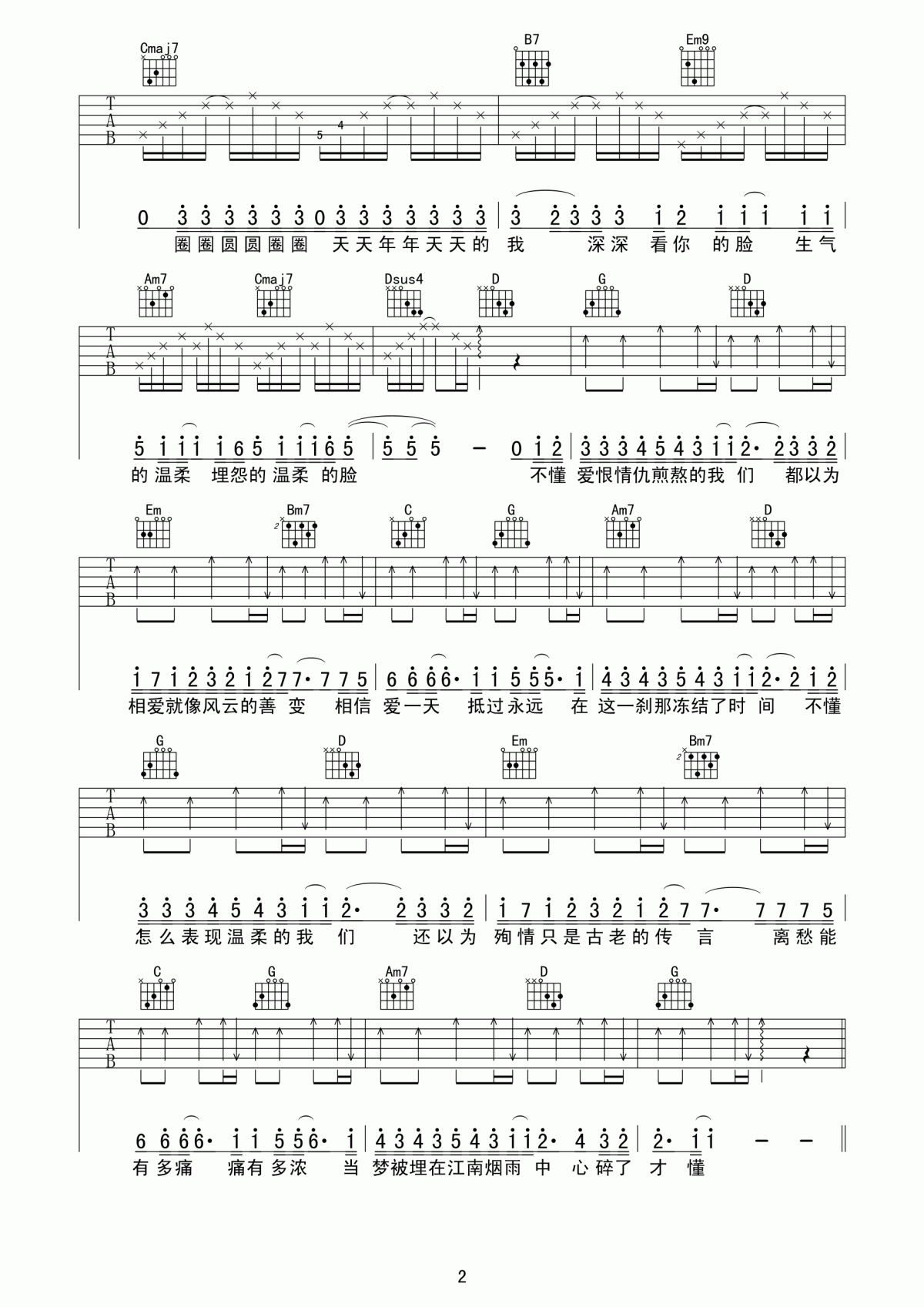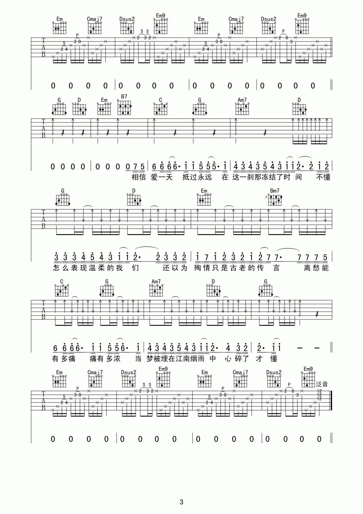 曲谱介绍: 林俊杰《江南》吉他弹唱谱,采用G调指法编配,共有3张高清图谱。