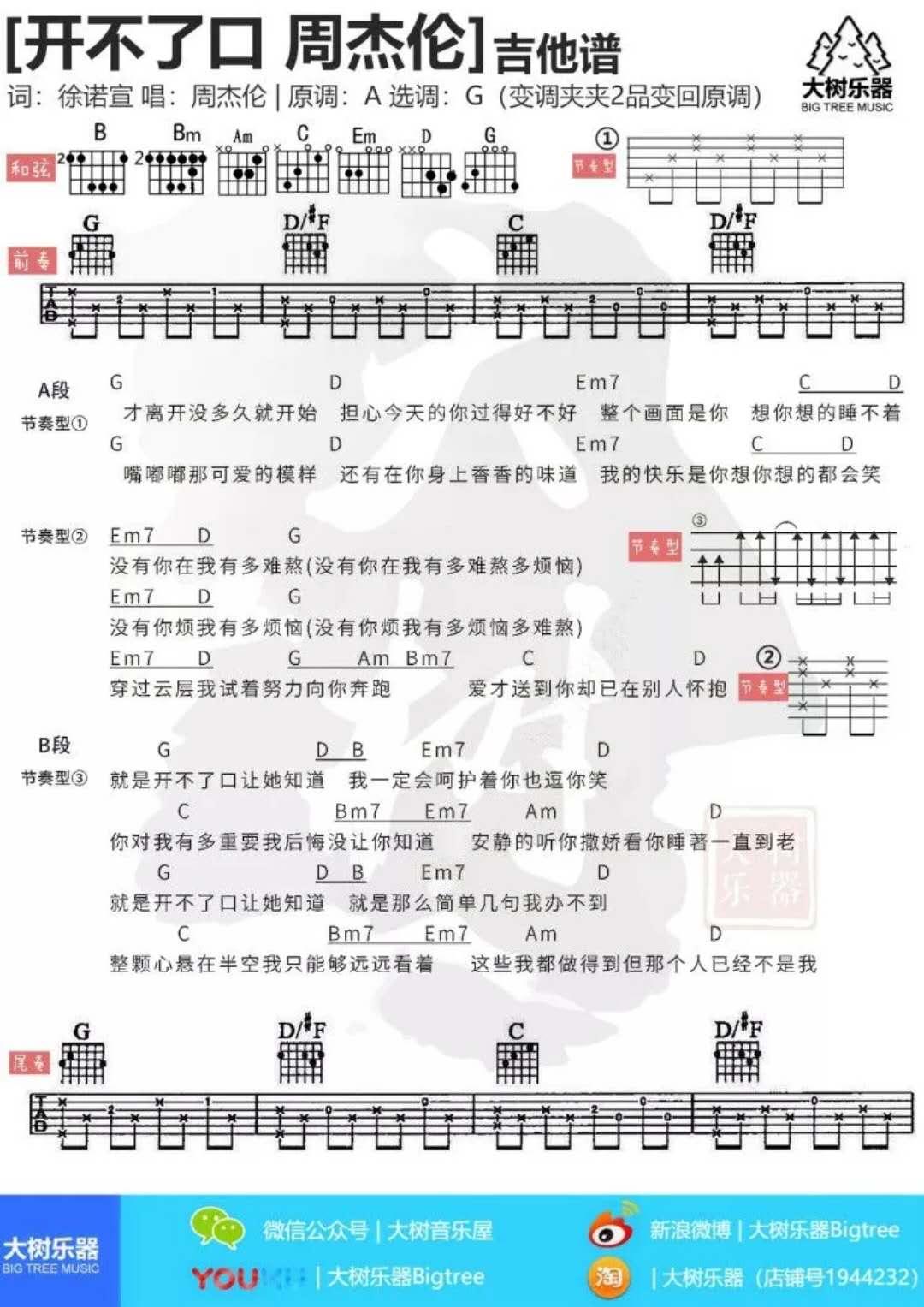 曲谱介绍: 开不了口《开不了口_G调》吉他弹唱谱,采用G调指法编配,共有1张高清图谱,免翻页排版设计。