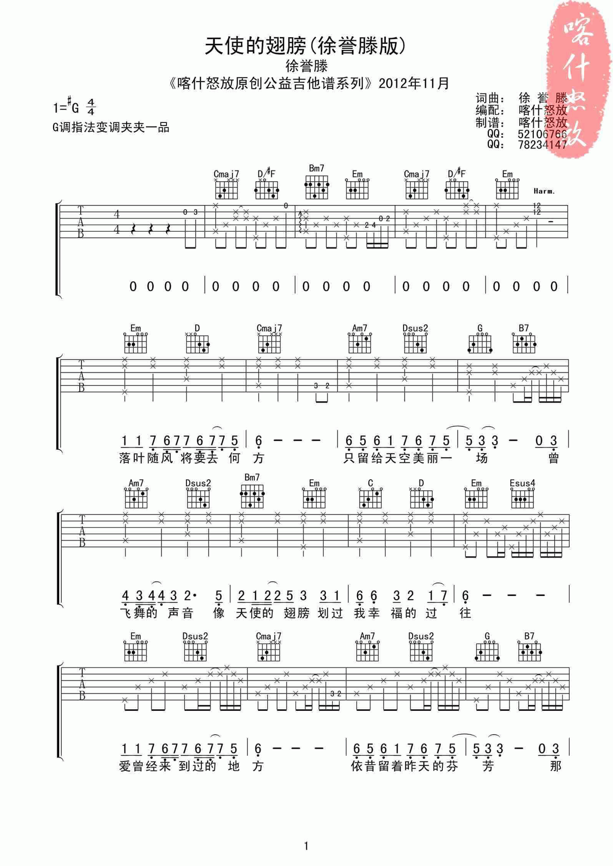 曲谱介绍: 《徐誉滕版天使的翅膀》吉他弹唱谱,采用G调指法编配,共有2张高清图谱,免翻页排版设计。