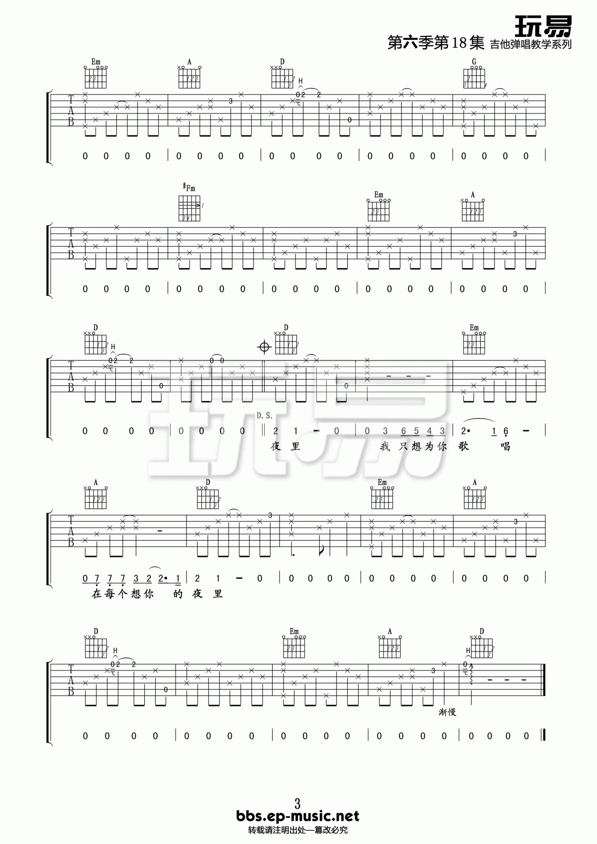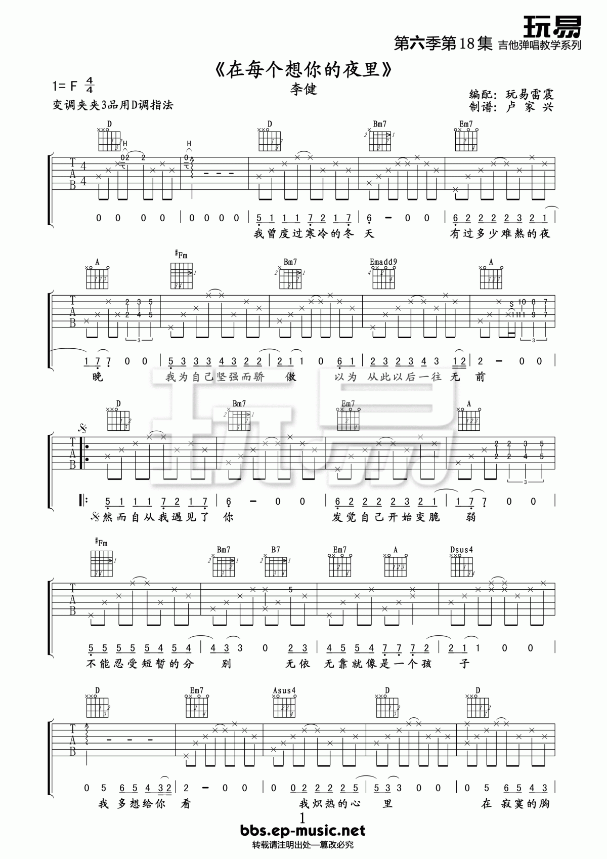 曲谱介绍: 李健《在每个想你的夜晚》吉他弹唱谱,采用D调指法编配,共有3张高清图谱。