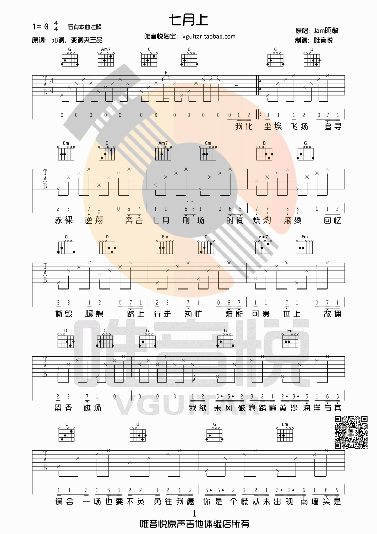 七月上吉他谱 - Jam阿敬 - G调吉他弹唱谱