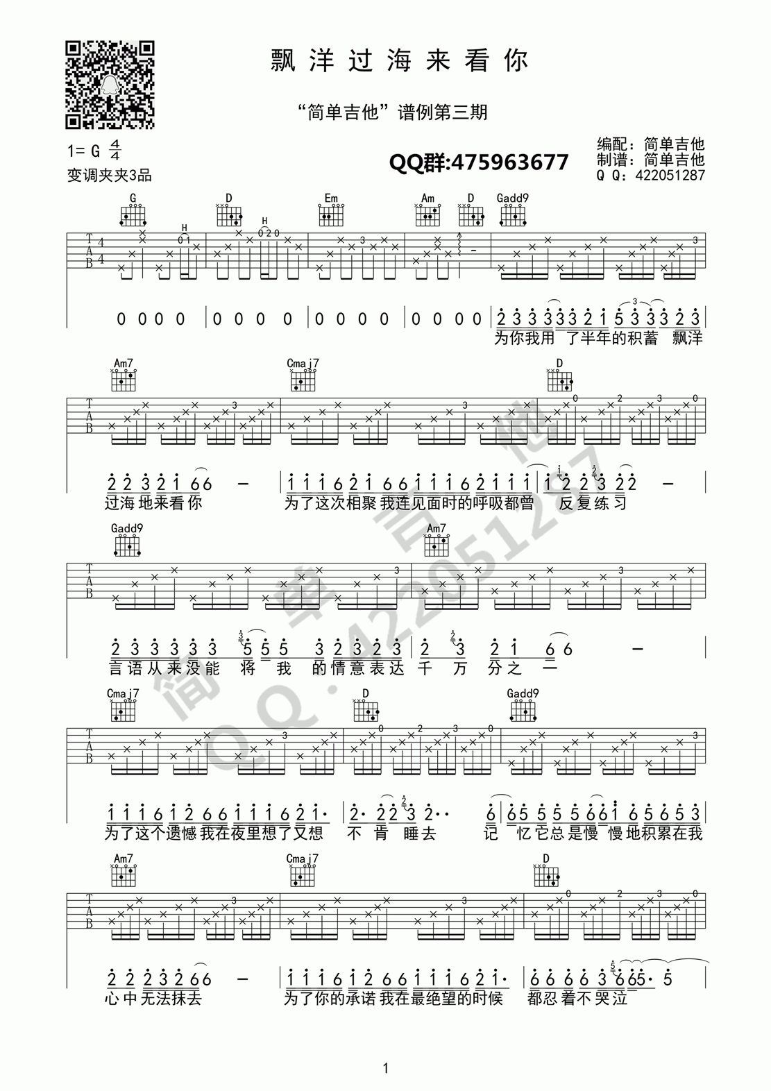 曲谱介绍: 李宗盛漂洋过海来看你吉他谱,G调指法六线谱,变调夹夹三品