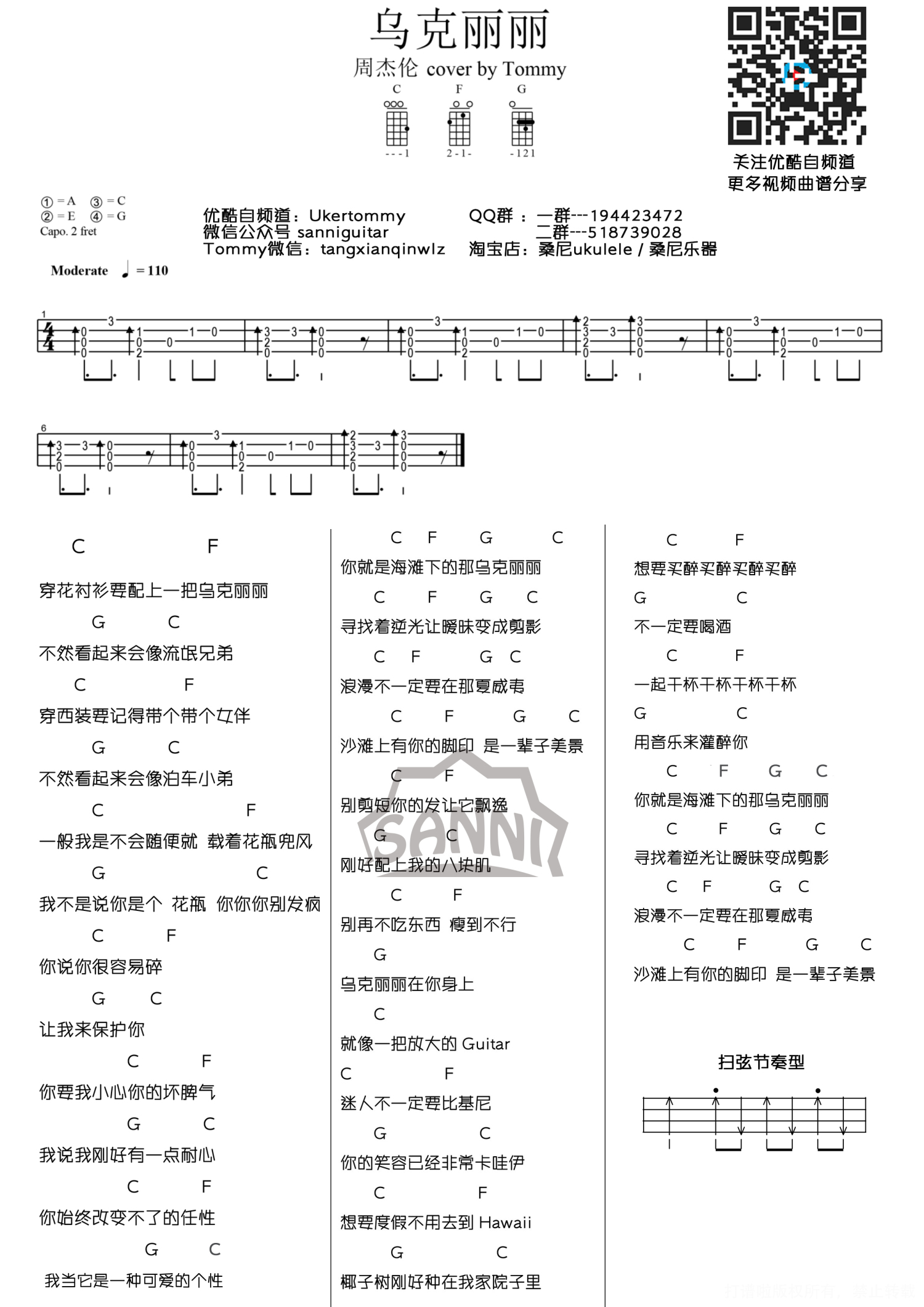 曲谱介绍: 视频:桑尼ukulele弹唱课堂《乌克丽丽》周杰伦