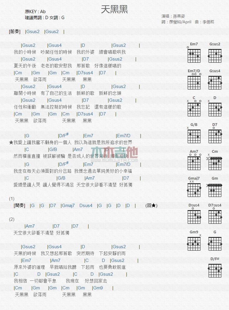 当前位置:琴谱网>吉他弹唱>天黑黑
