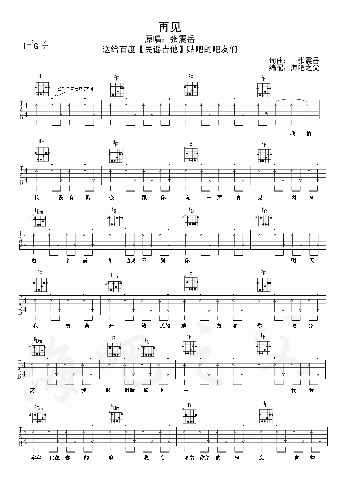 曲谱介绍: 张震岳《再见》吉他弹唱谱,采用G调指法编配,共有2张高清图谱,免翻页排版设计。