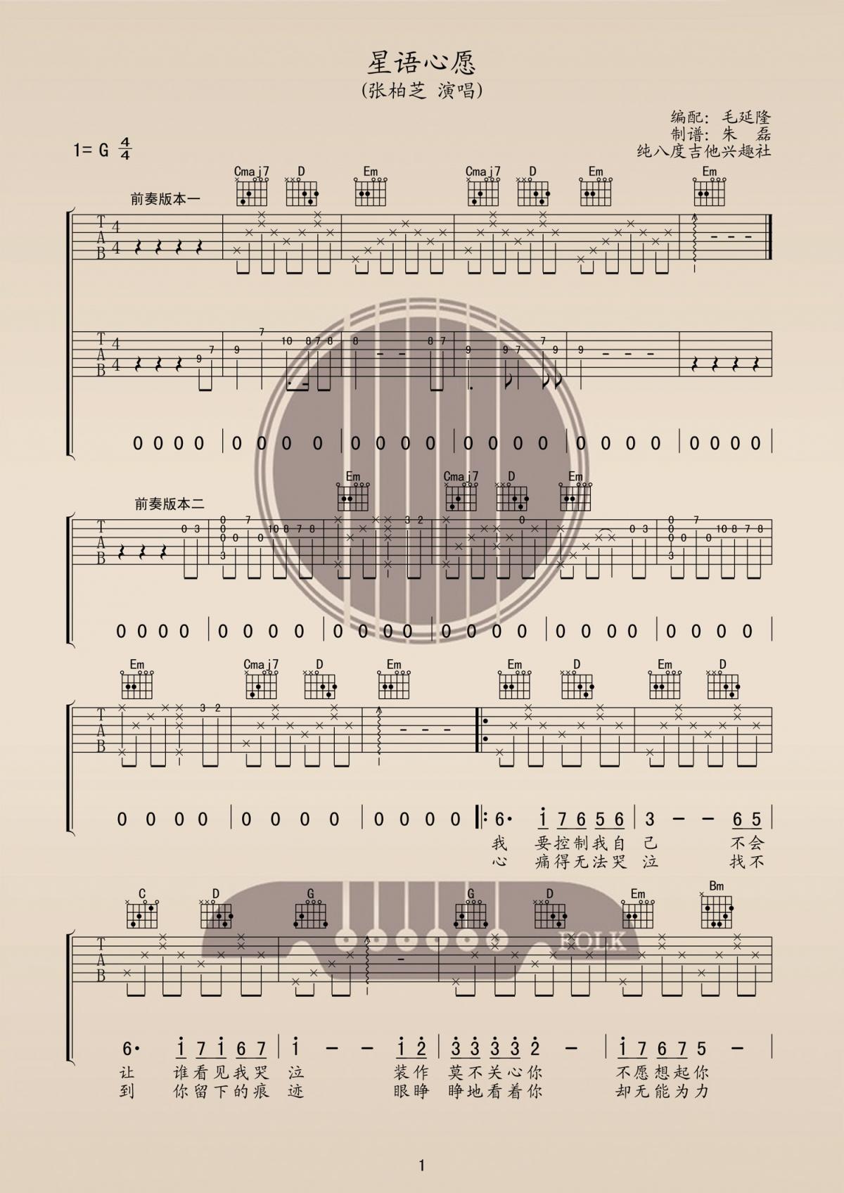 曲谱介绍: 张柏芝《张柏芝星语心愿》吉他弹唱谱,采用G调指法编配,共有2张高清图谱,免翻页排版设计。