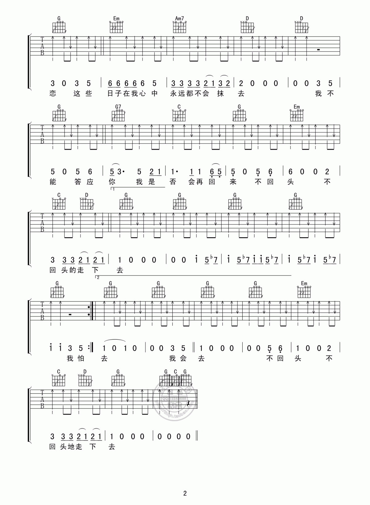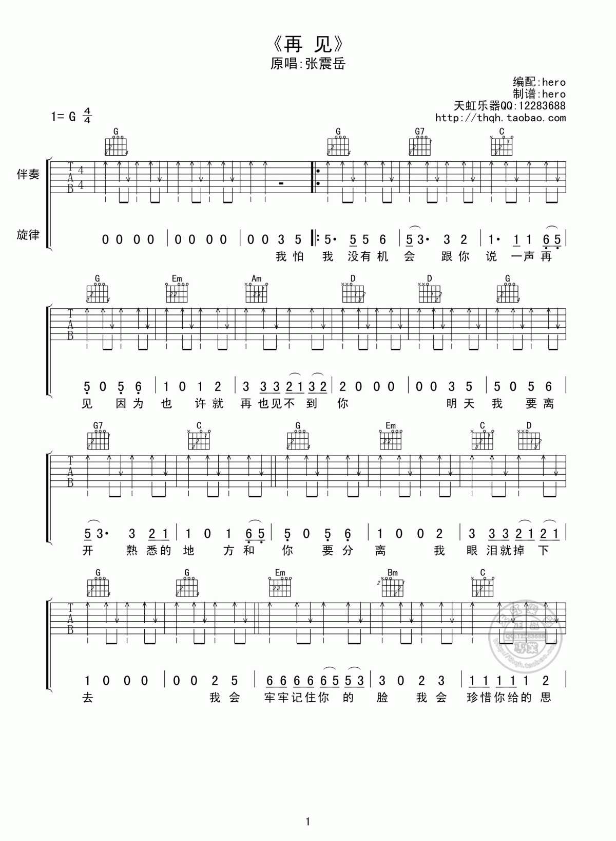 曲谱介绍: 张震岳《再见》吉他弹唱谱,采用G调指法编配,共有2张高清图谱,免翻页排版设计。