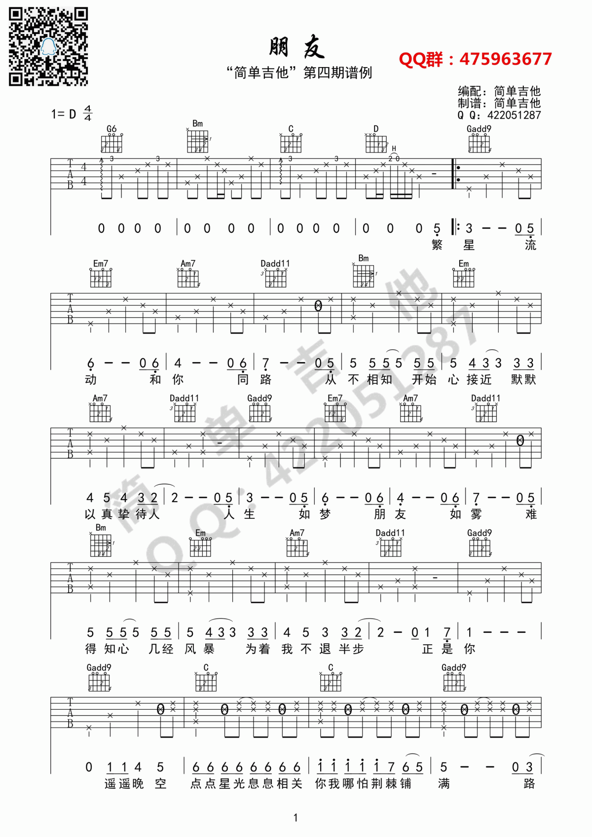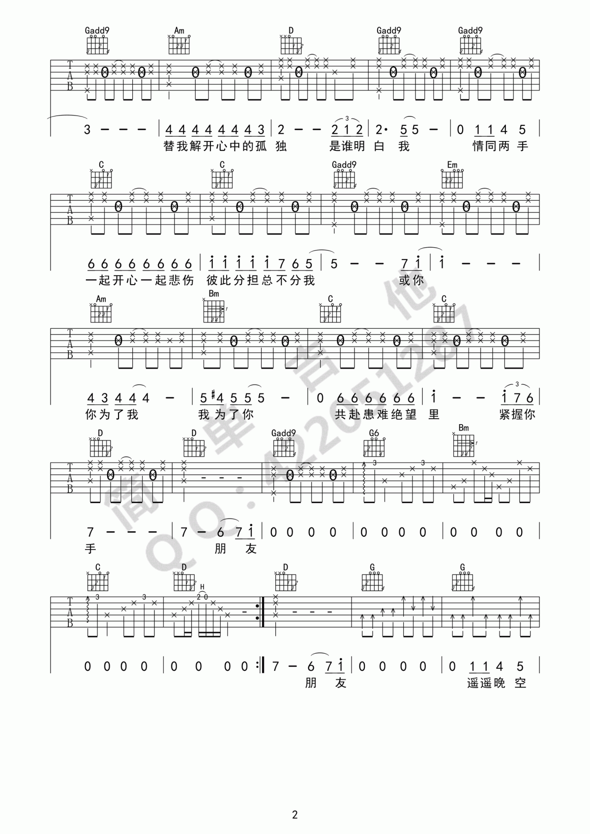 朋友吉他谱 - D调吉他弹唱谱