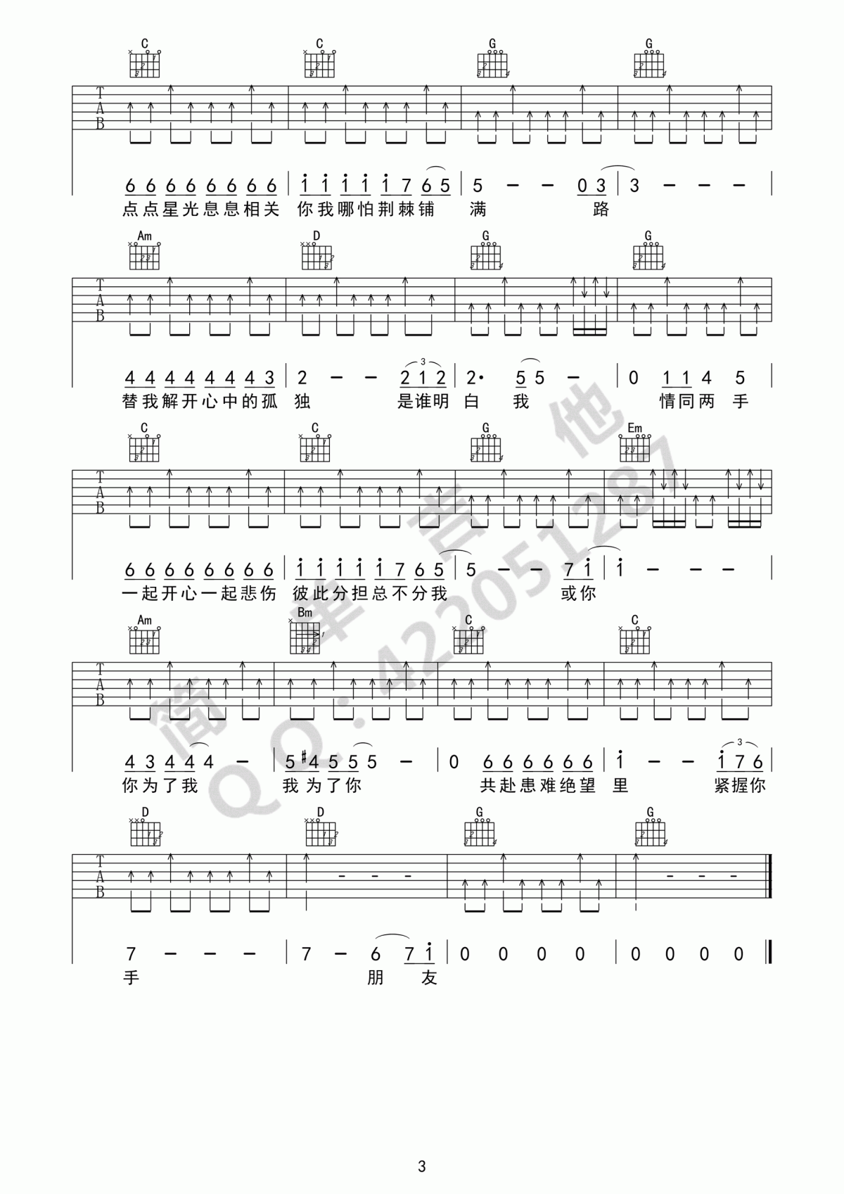 曲谱介绍: 《朋友》吉他弹唱谱,采用D调指法编配,共有3张高清图谱。