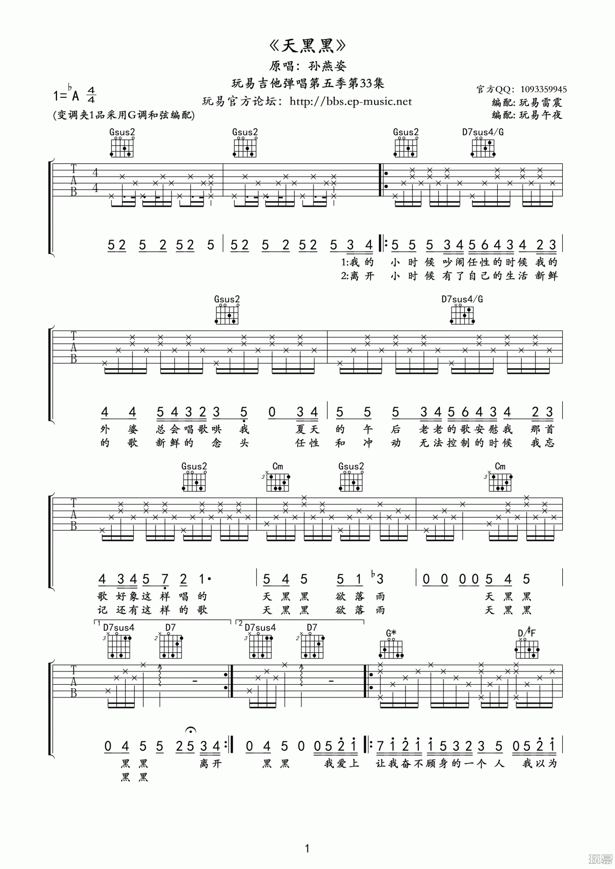 天黑黑吉他谱 - G调吉他弹唱谱