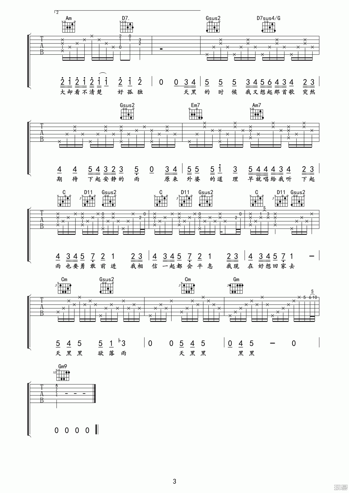 曲谱介绍: 《天黑黑》吉他弹唱谱,采用G调指法编配,共有3张高清图谱。