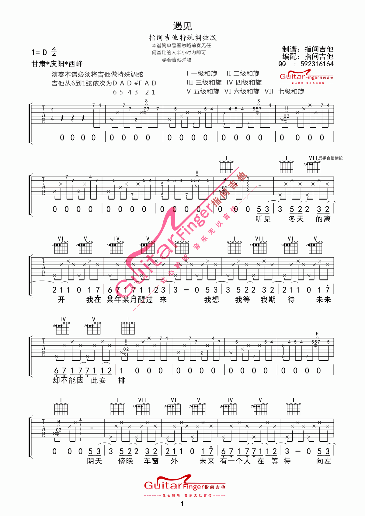 曲谱介绍: 孙燕姿《遇见》吉他弹唱谱,采用D调指法编配,共有3张高清图谱。