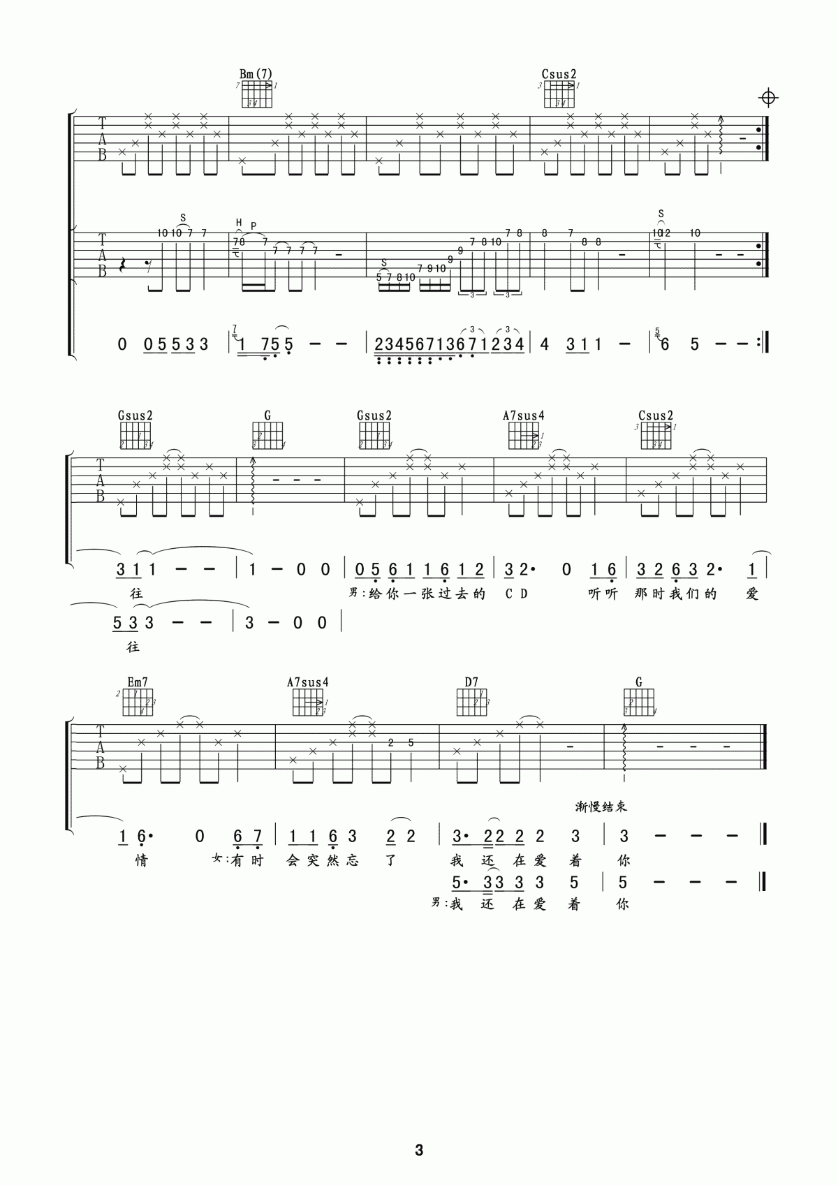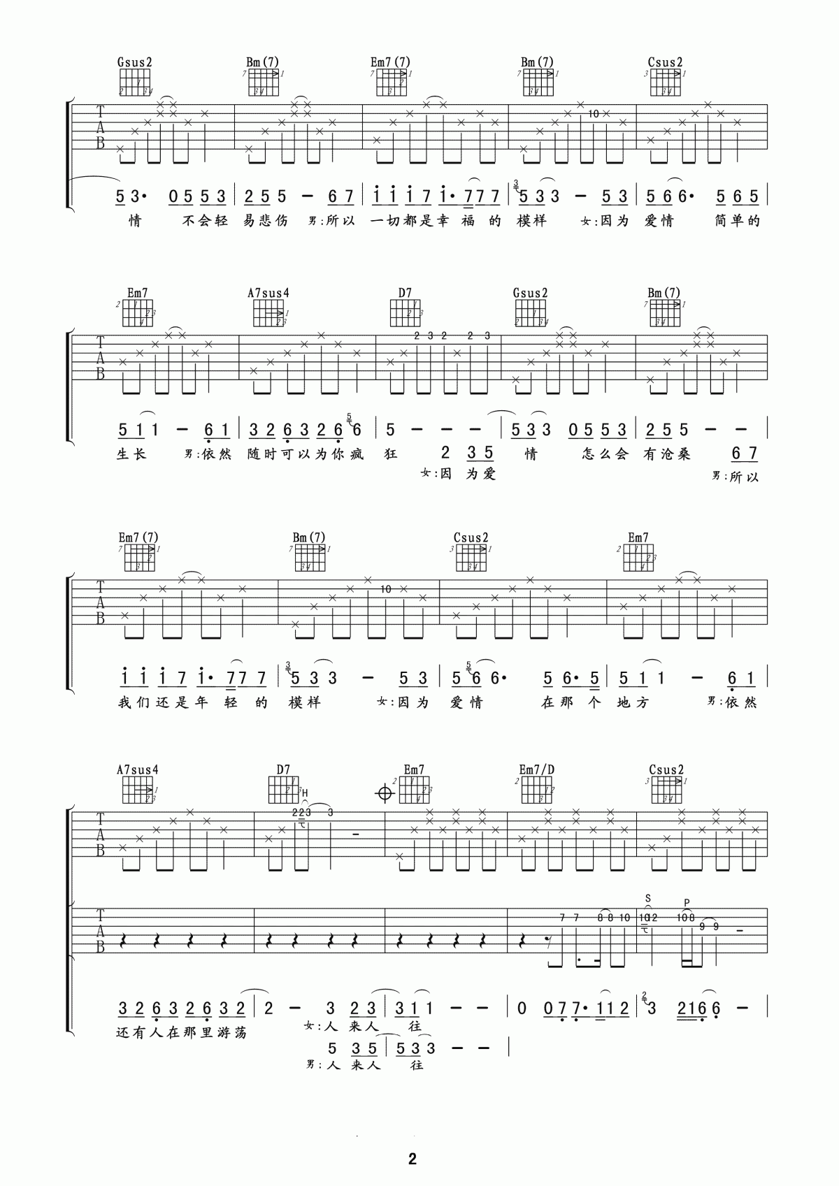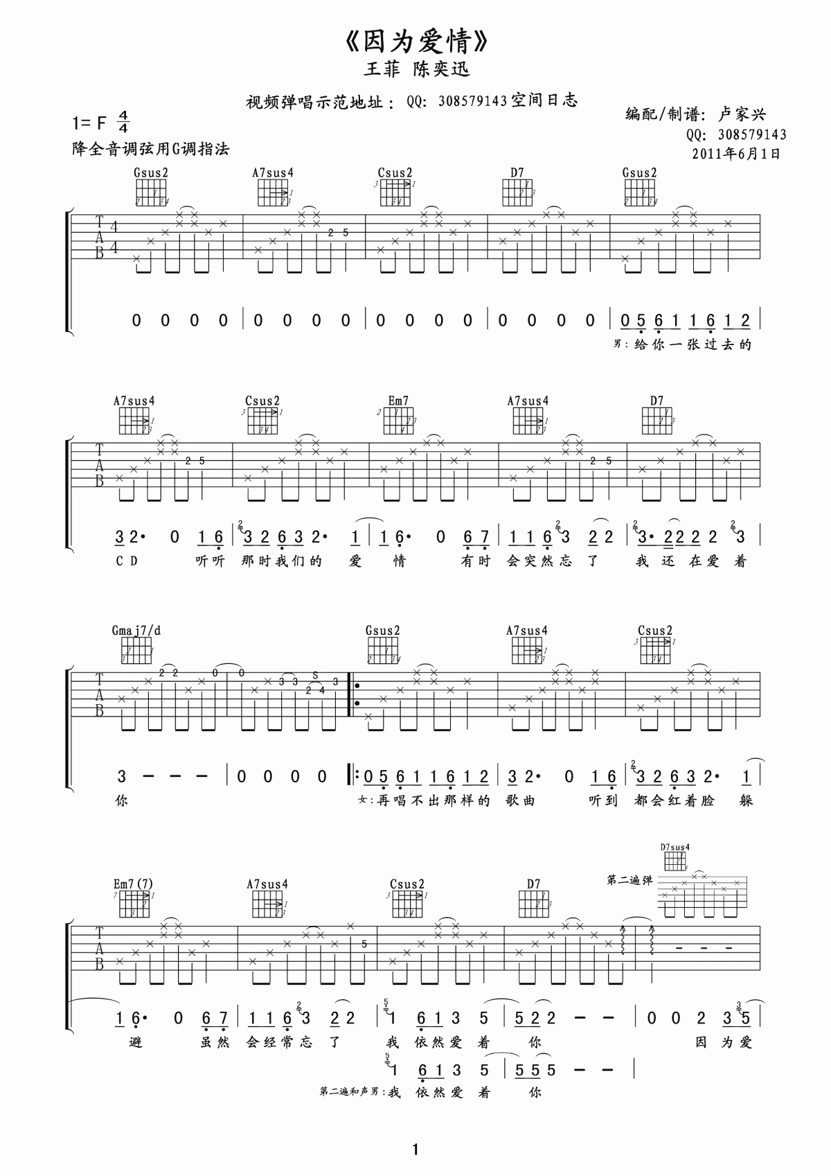 曲谱介绍: 王菲/陈奕迅《王菲/陈奕迅因为爱情》吉他弹唱谱,采用G调指法编配,共有3张高清图谱。