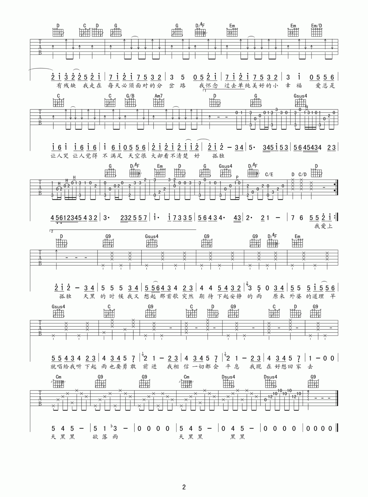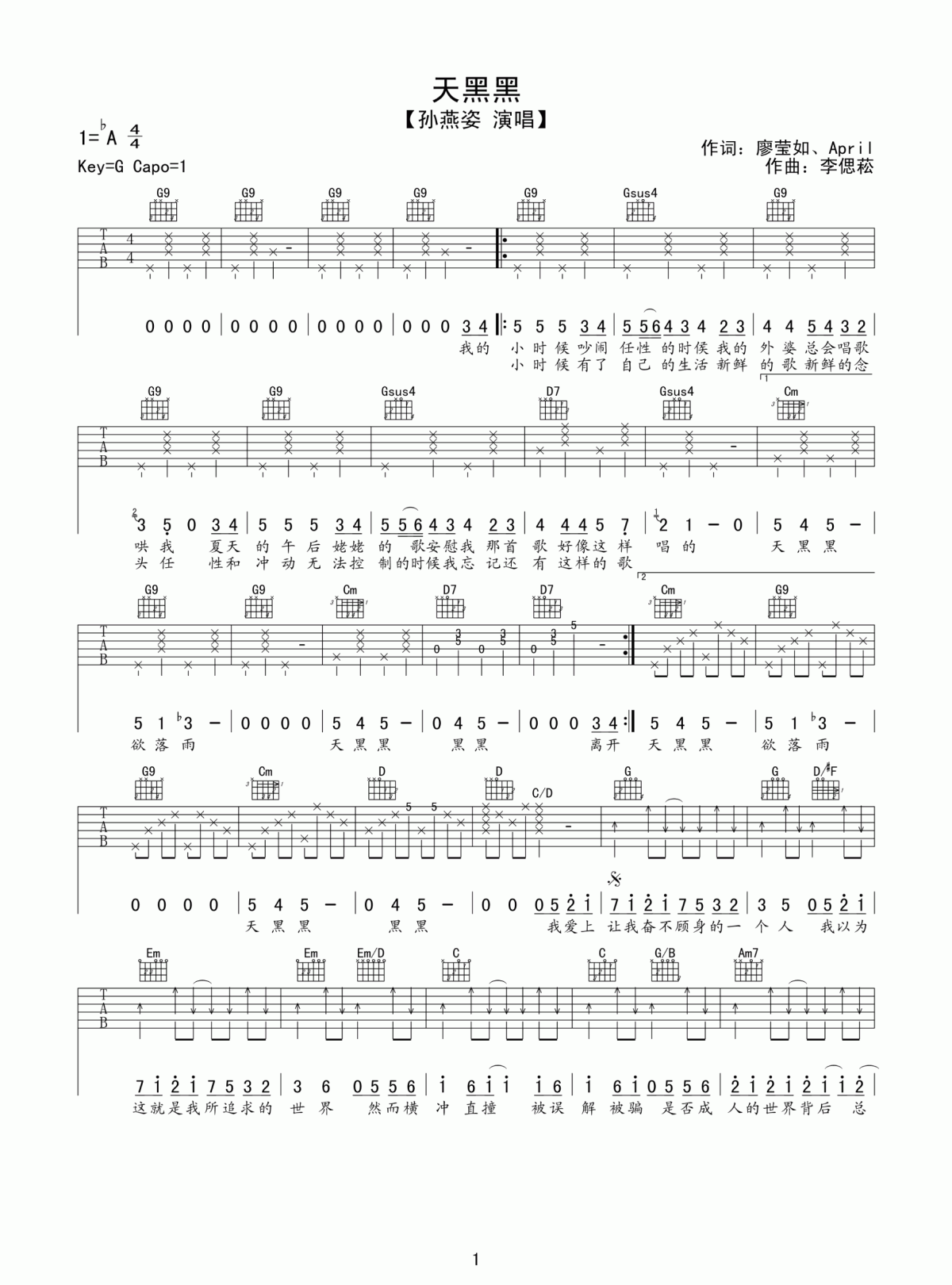 曲谱介绍: 孙燕姿《天黑黑》吉他弹唱谱,采用G调指法编配,共有2张高清图谱,免翻页排版设计。