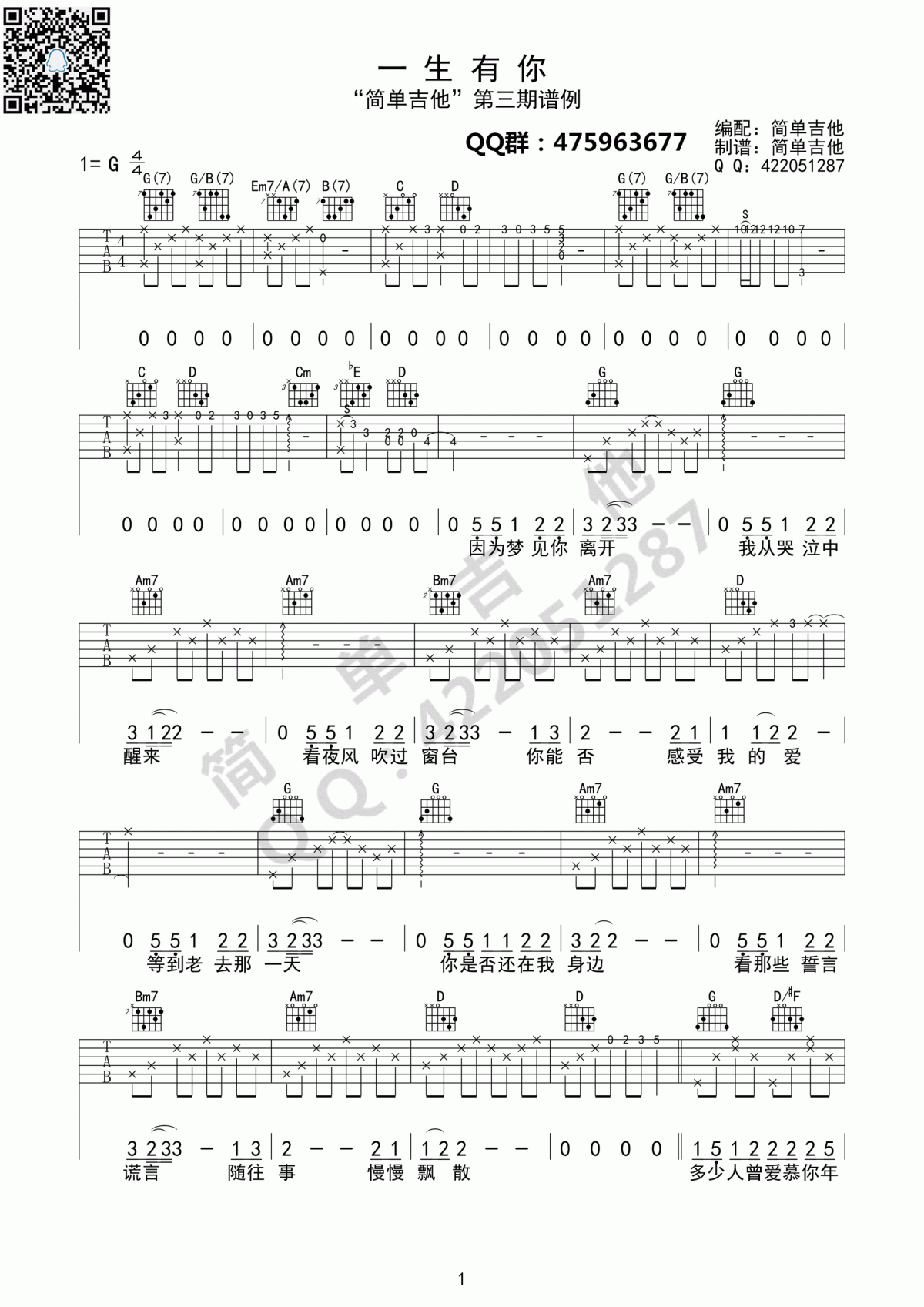 一生有你吉他谱 - G调吉他弹唱谱