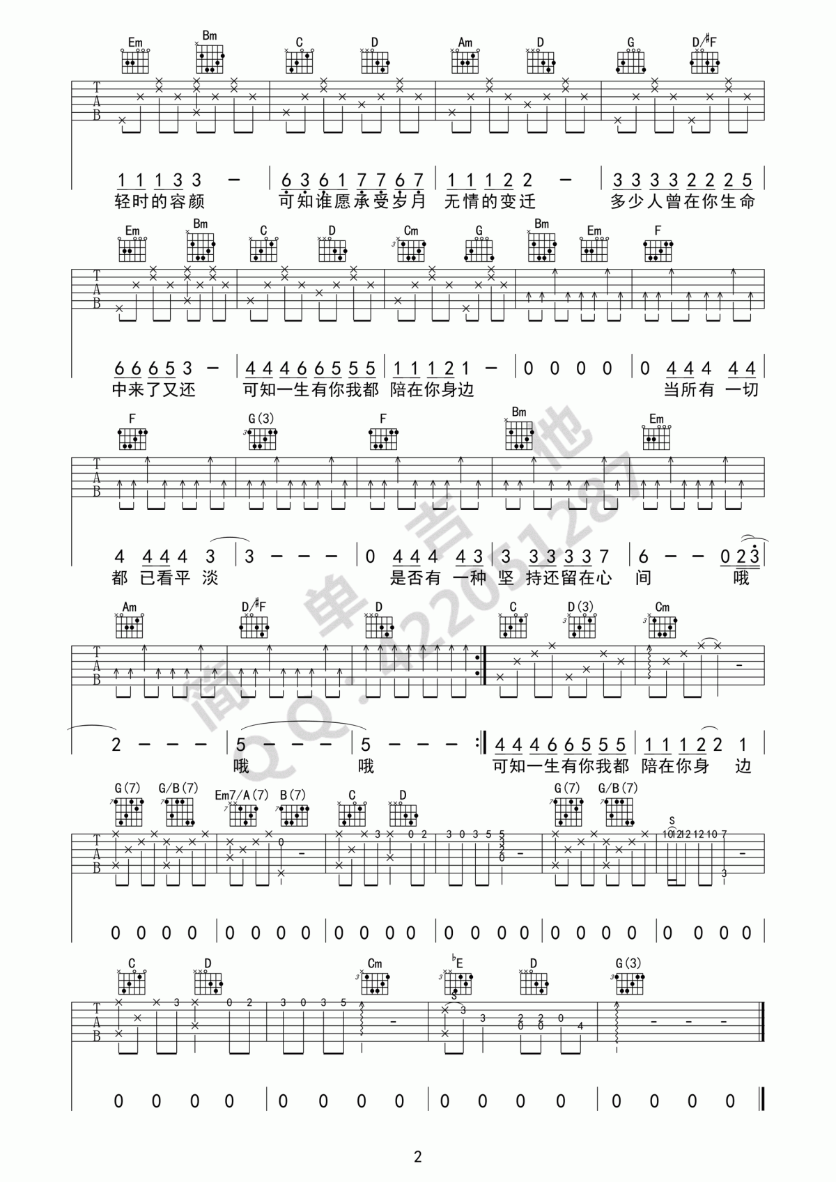 曲谱介绍: 《一生有你》吉他弹唱谱,采用G调指法编配,共有2张高清图谱,免翻页排版设计。