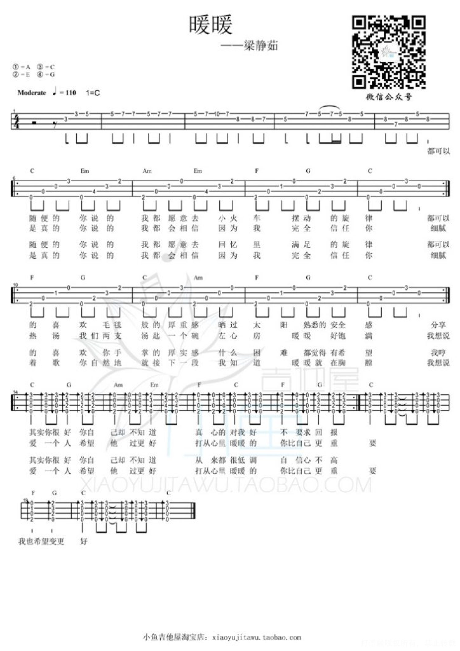 曲谱介绍: 梁静茹《暖暖》_C调尤克里里谱