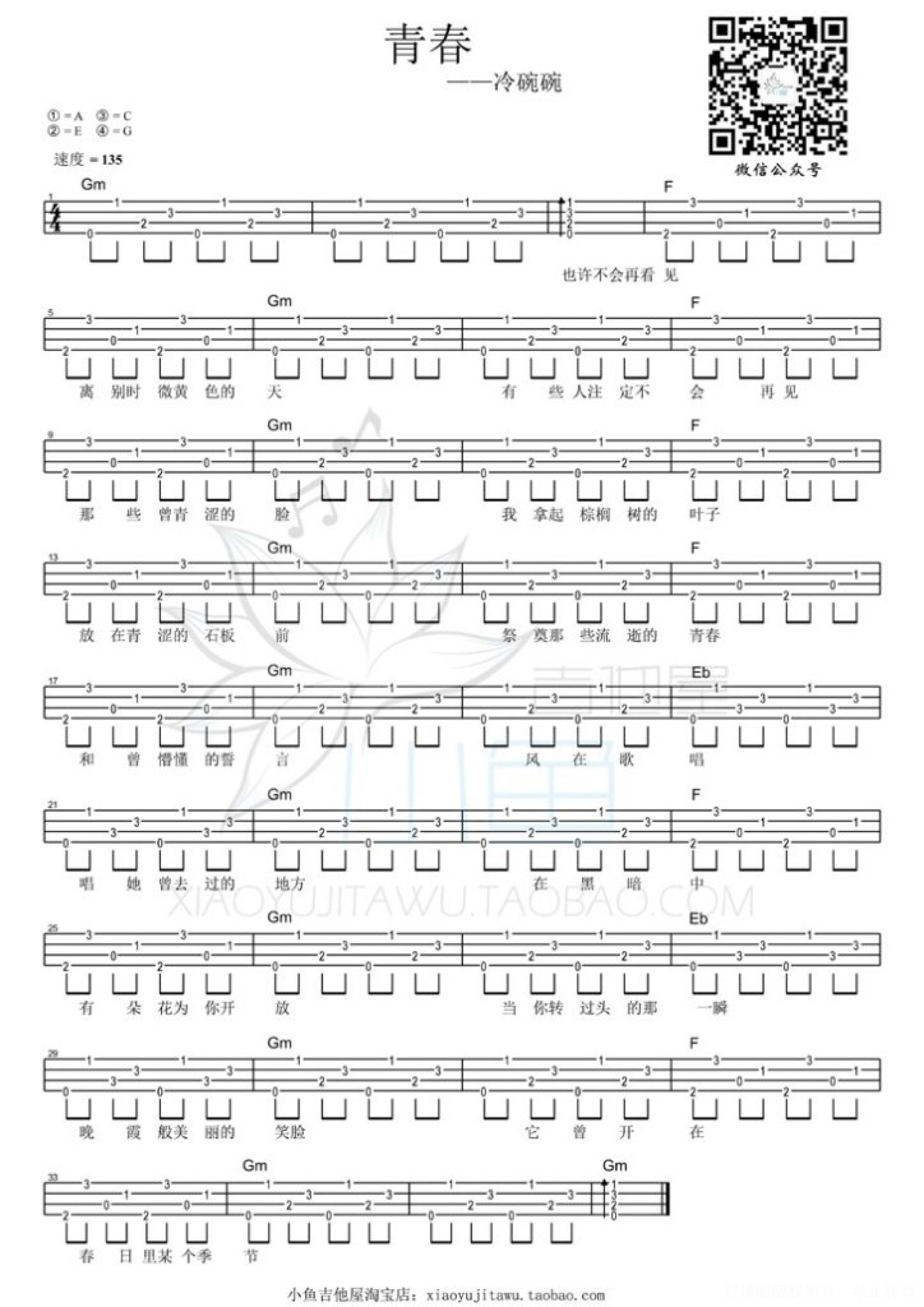 曲谱介绍: 冷碗碗《青春》_G调尤克里里谱