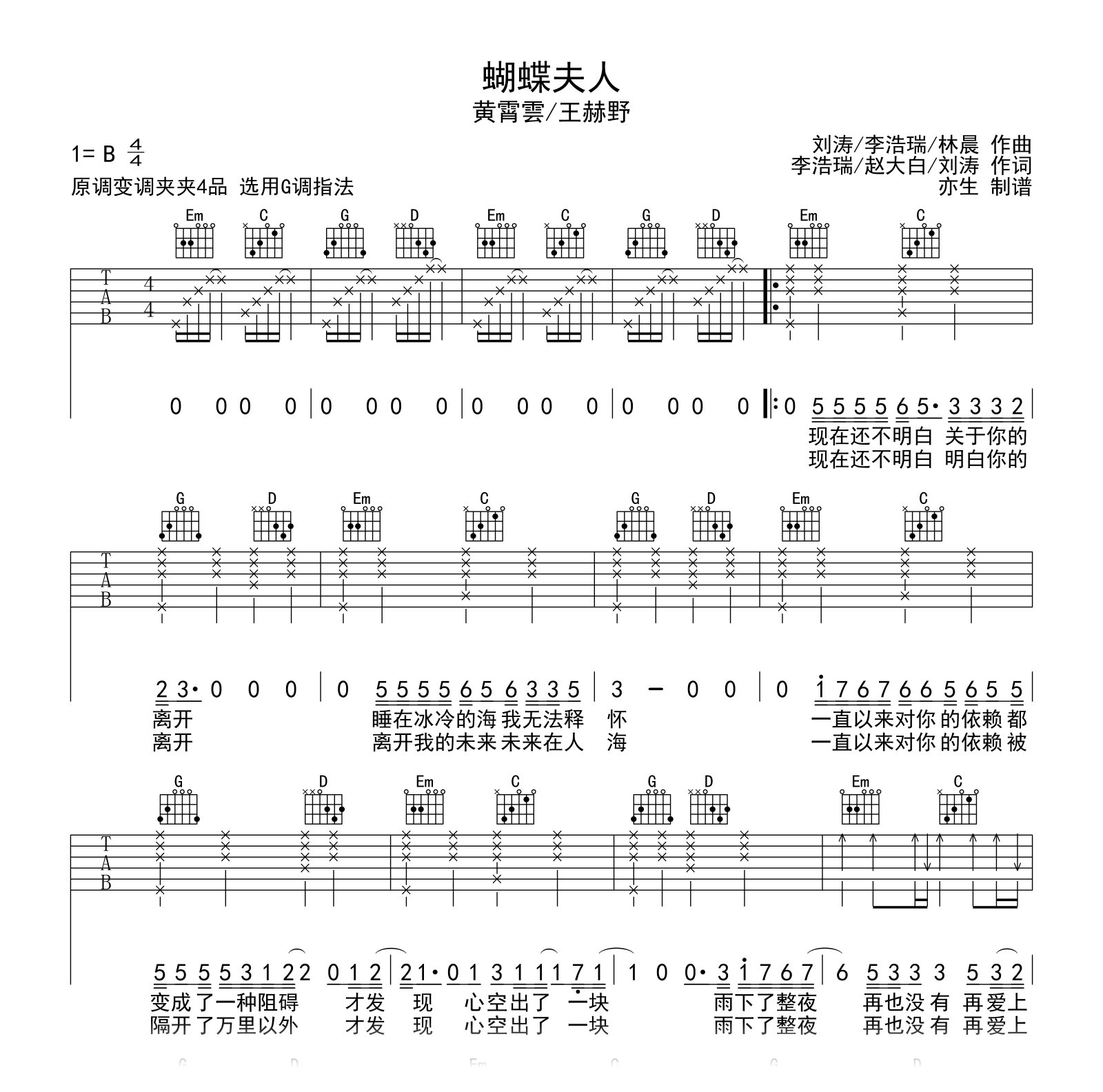 蝴蝶夫人吉他谱 - 黄霄云/王赫野 - G调吉他弹唱谱