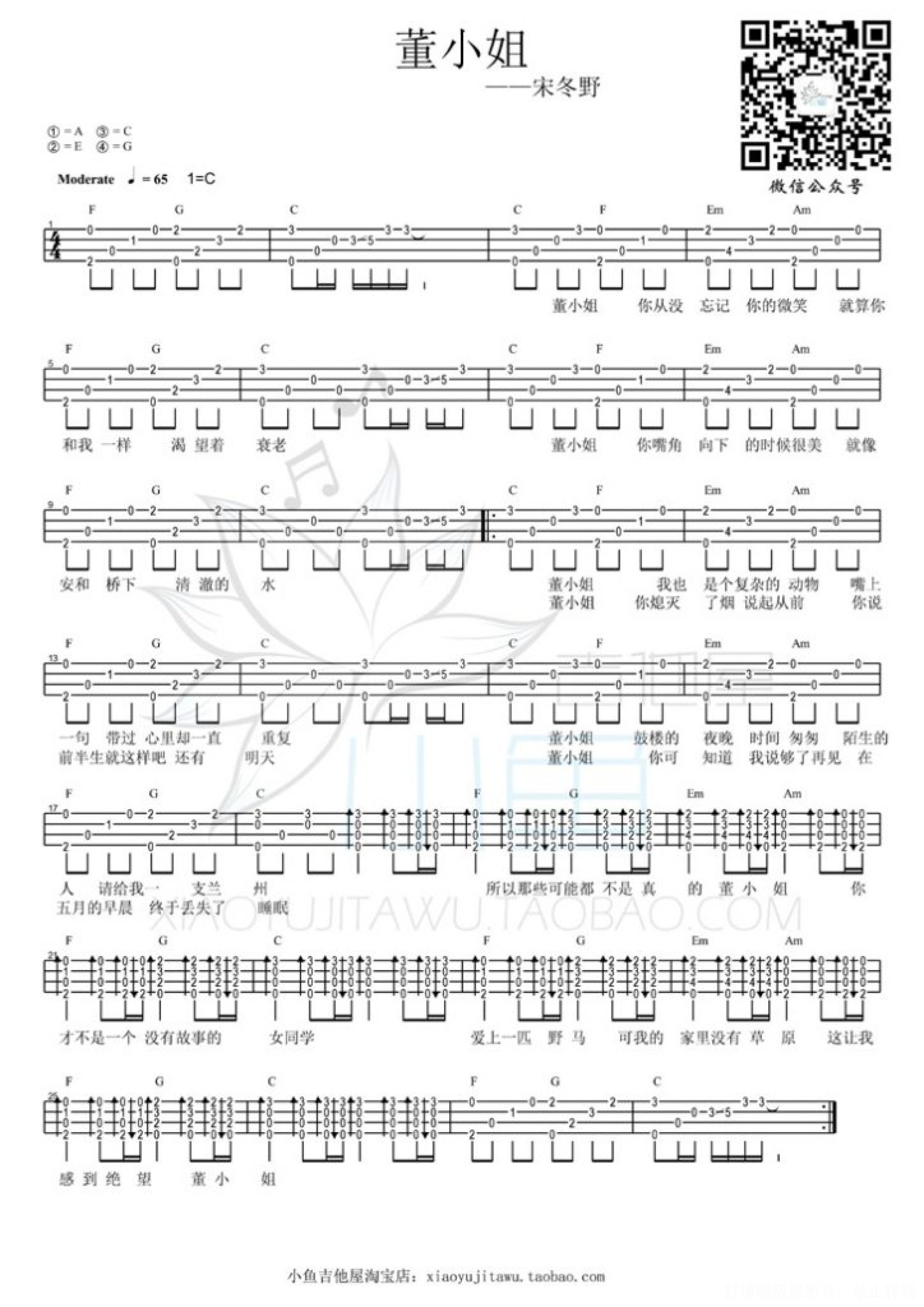 曲谱介绍: 宋冬野《董小姐》_C调尤克里里谱