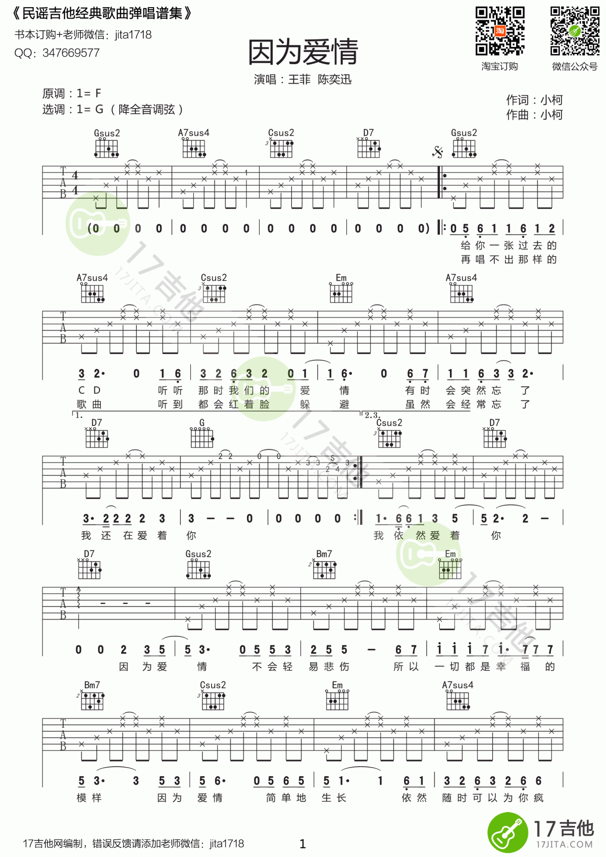 曲谱介绍: 王菲&陈奕迅《因为爱情》吉他弹唱谱,采用G调指法编配,共有2张高清图谱,免翻页排版设计。