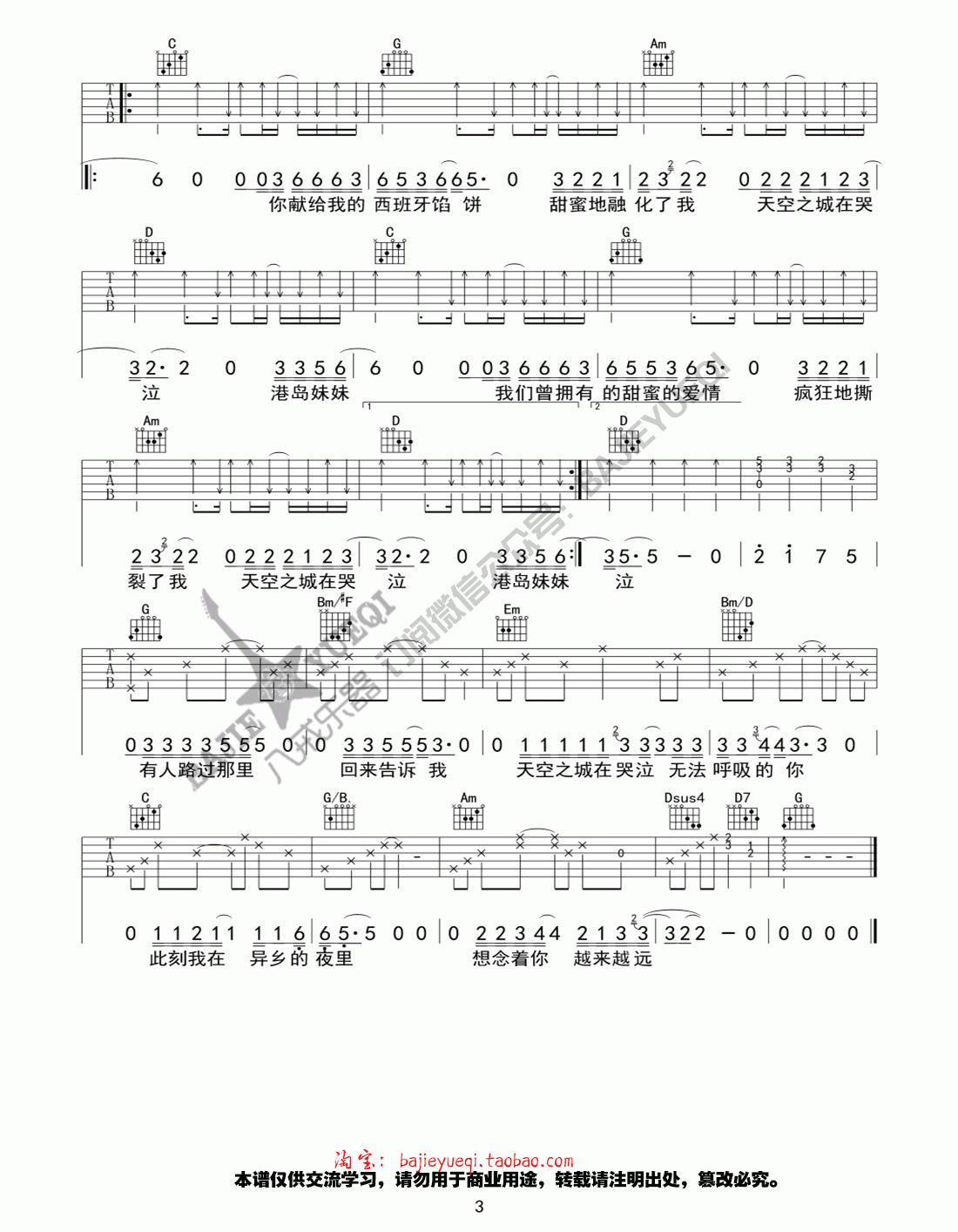 曲谱介绍: 好声音蒋敦豪《天空之城》吉他弹唱谱,采用G调指法编配,共有3张高清图谱。