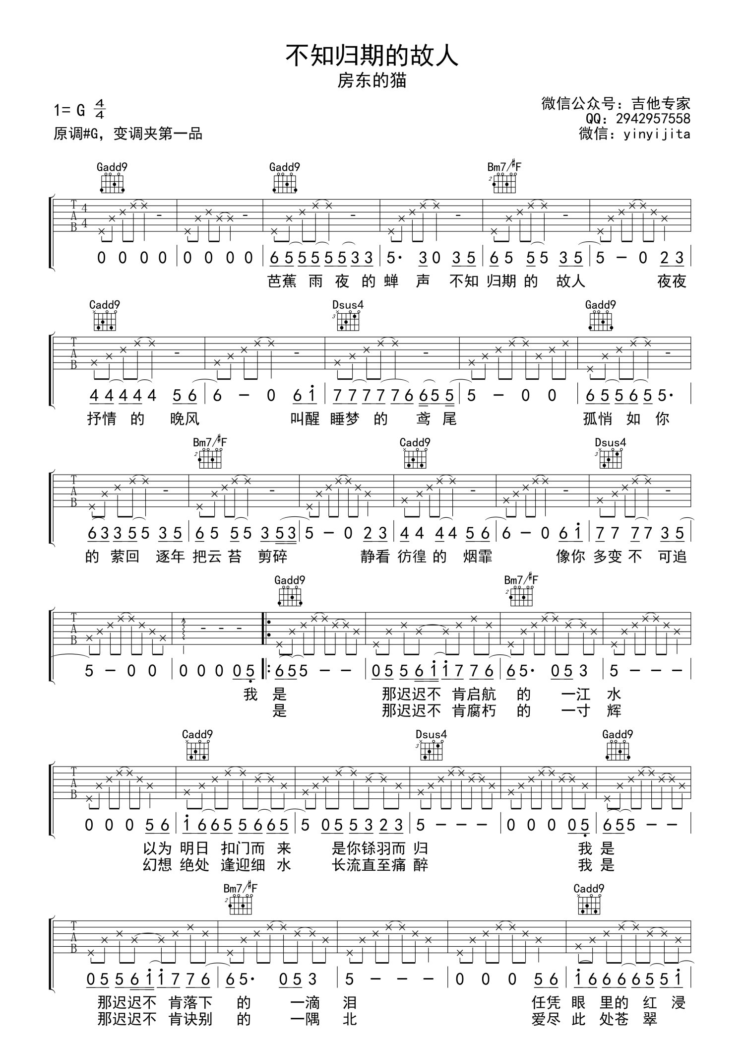 • 不知归期的故人吉他谱 - 房东的猫 - G调吉他弹唱谱第1张