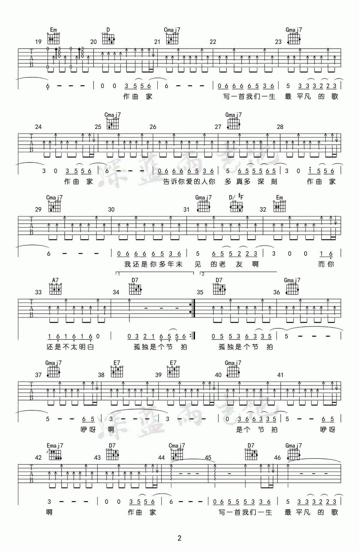 曲谱介绍: 李荣浩《作曲家》吉他弹唱谱,采用G调指法编配,共有3张高清图谱。