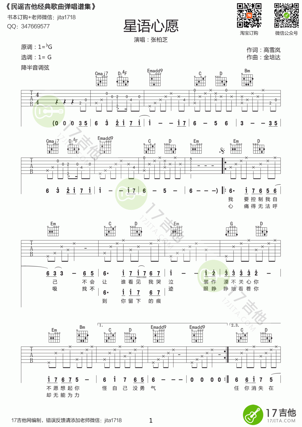 曲谱介绍: 张柏芝《星语心愿》吉他弹唱谱,采用G调指法编配,共有2张高清图谱,免翻页排版设计。