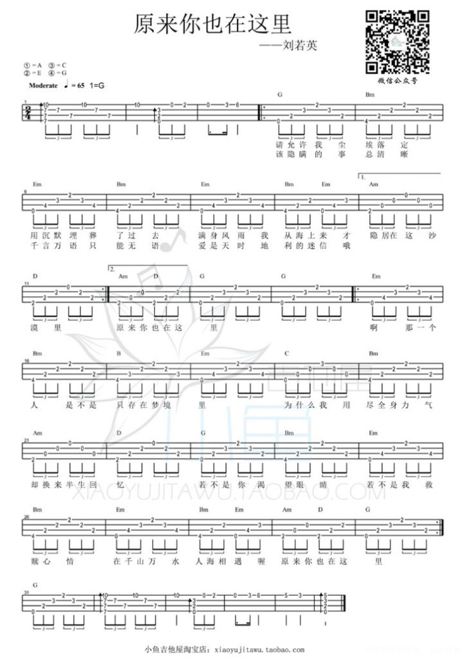 曲谱介绍: 刘若英《原来你也在这里》_G调尤克里里谱