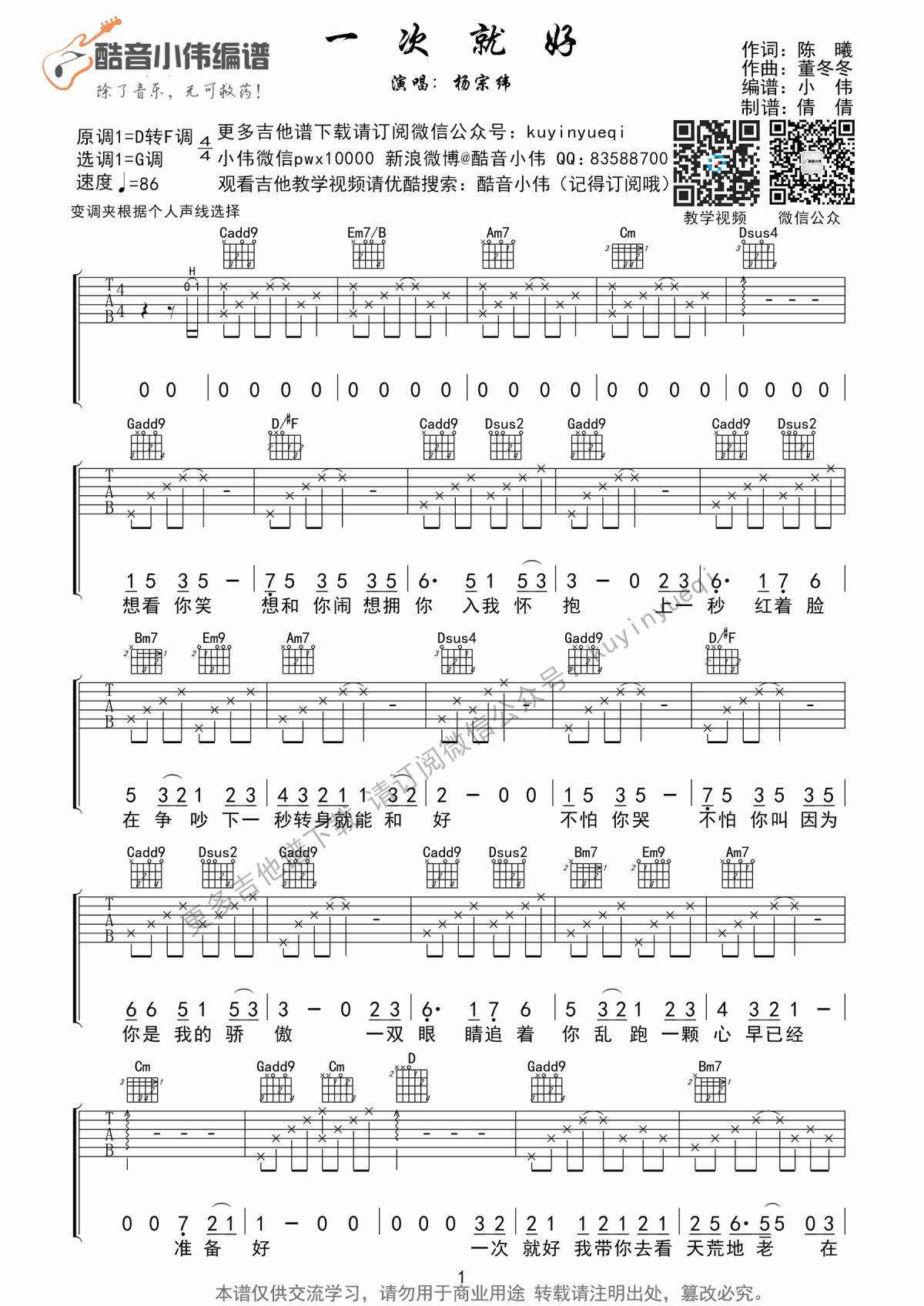 一次就好吉他谱 - 杨宗纬 - G调吉他弹唱谱