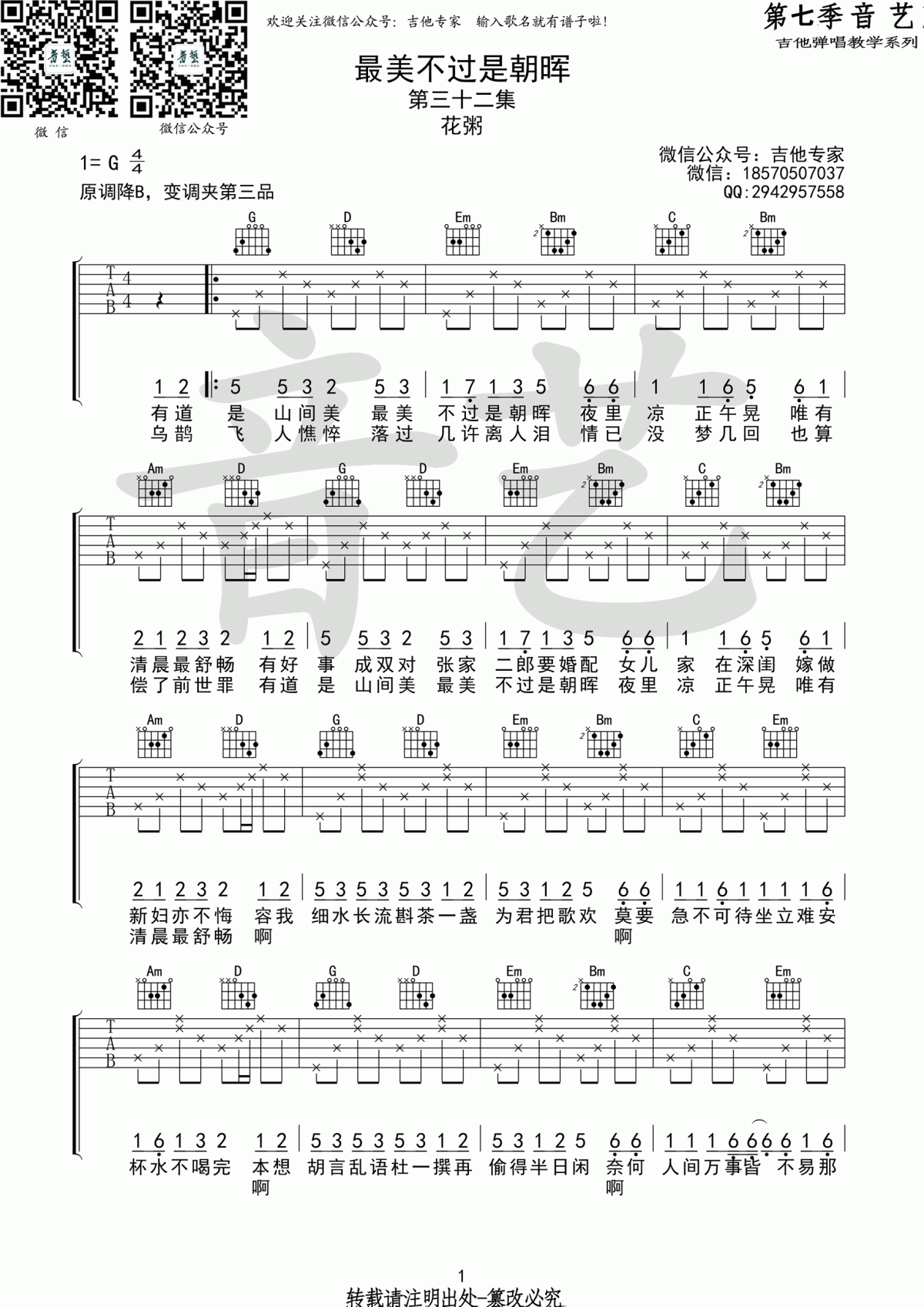 最美不过是朝晖吉他谱 - 花粥 - G调吉他弹唱谱 - 原版