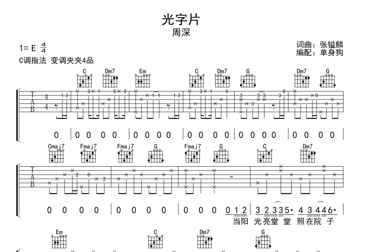 曲谱介绍: 光字片吉他谱,周深演唱的一首《人世间》电视剧歌曲,细腻而温柔的嗓音配合婉转的曲风演绎着故事中的悲欢离合、人间烟火,当大家真正听到这首歌曲的时候,治愈满满的味道总让人听不够,甚至可以湿润眼眶,他演绎的故事感太强了,故事中的画面顿时闪现在脑海里。 光字片吉他谱,周深演唱,选用C调,光字片六线谱,共有三张高清图片谱,建议变调夹夹4品弹唱原调,包含完整的前奏,弹唱难度初级简单。