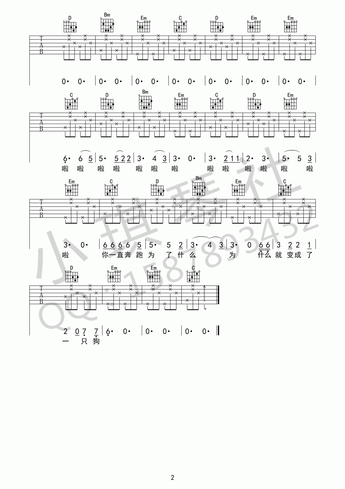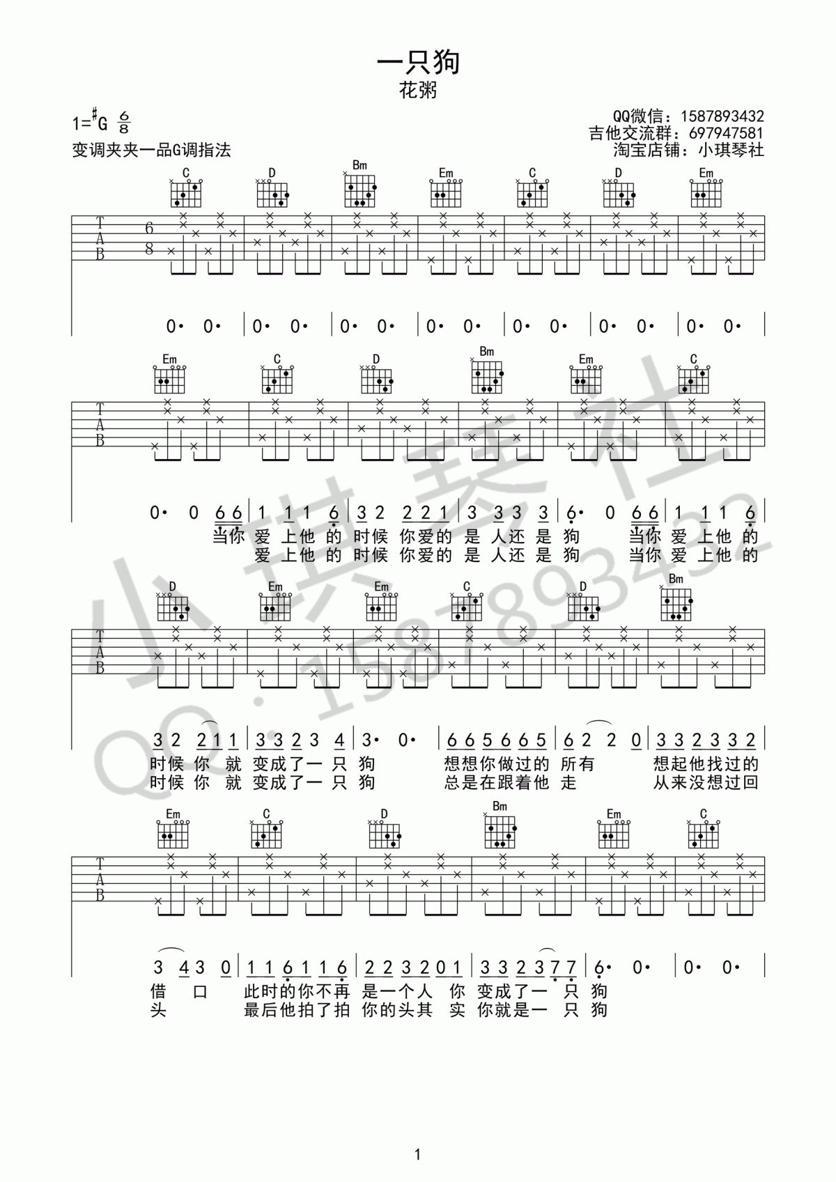 曲谱介绍: 花粥《一只狗》吉他谱,一只狗六线谱,原调#G,选用G调指法,变调夹夹一品。花粥,四思的民歌吉他演唱,高清图片演唱,多亏了小齐琴俱乐部的制作,网站上传。