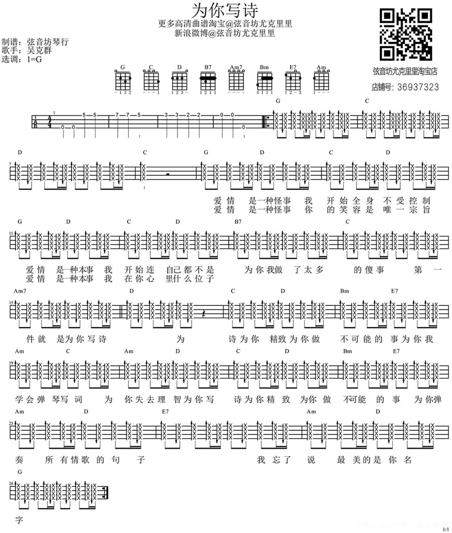 曲谱介绍: 吴克羣《为你写诗》_G调尤克里里谱
