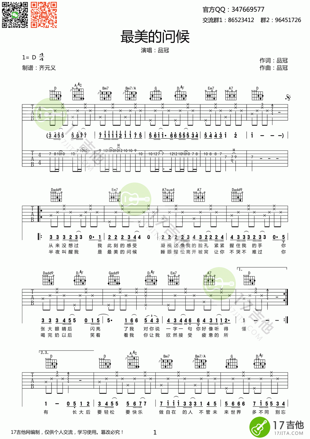 曲谱介绍: 最美的问候吉他谱品冠词曲演唱的歌曲,最美的问候吉他弹唱六线谱,最美的问候吉他谱,六线谱D调指法。这是品冠送给儿子小V的生日礼物,也被称为小V之歌。这首歌直截了当,感人肺腑,表达了他对儿子幸福成长的希望。感谢编译器的另一面。有两张照片。