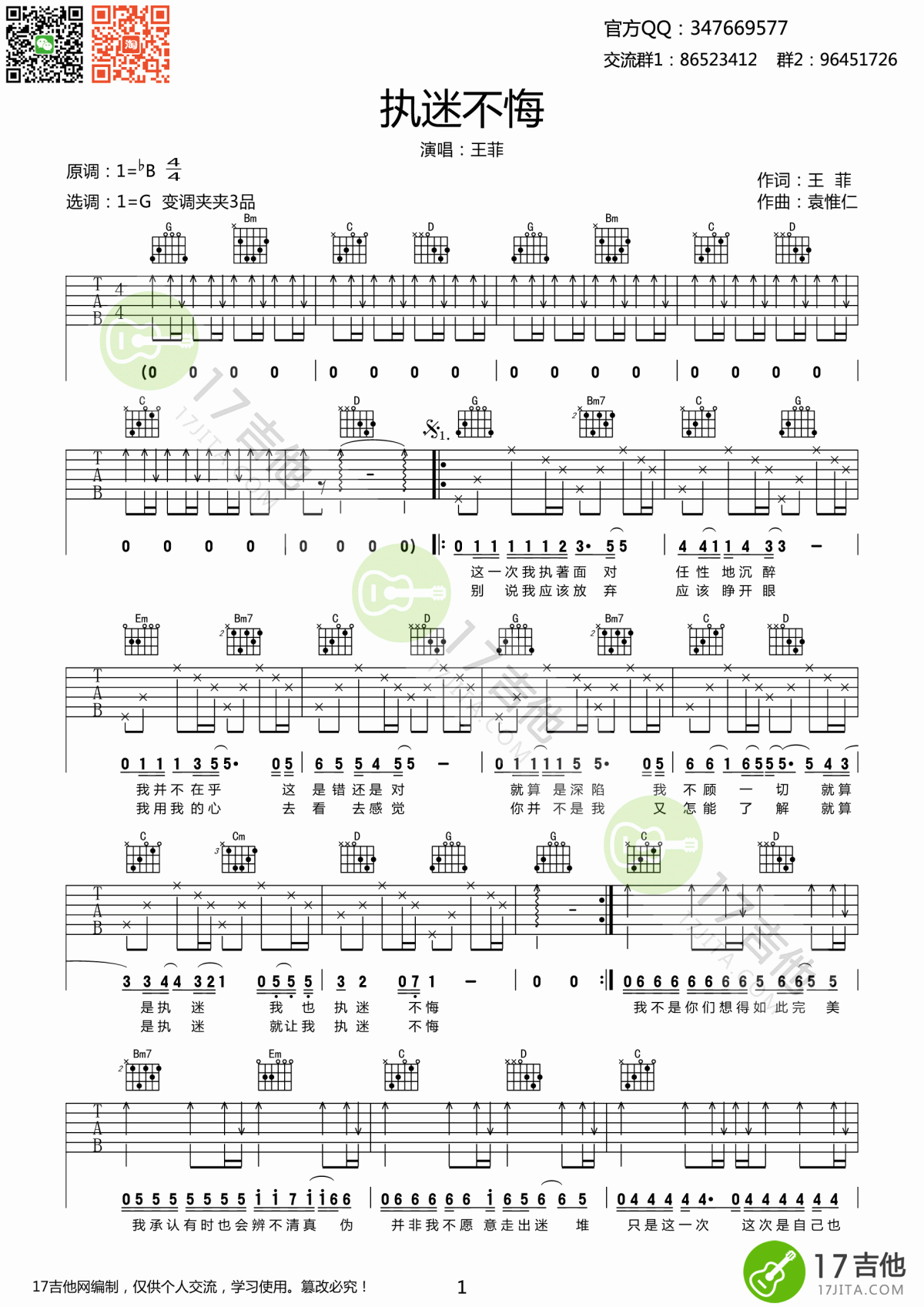 曲谱介绍: 王菲《执迷不悔》吉他谱,原调bB,选调G,变调夹夹三品。我要有不屈不挠的勇气,不屈不挠的毅力,所有的毅力都是因为自愿。王菲的经典情歌是送给每一个在南墙下徘徊的人的。