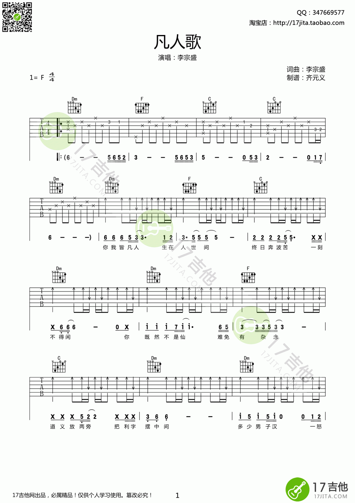 凡人歌吉他谱 - 李宗盛 - F调吉他弹唱谱