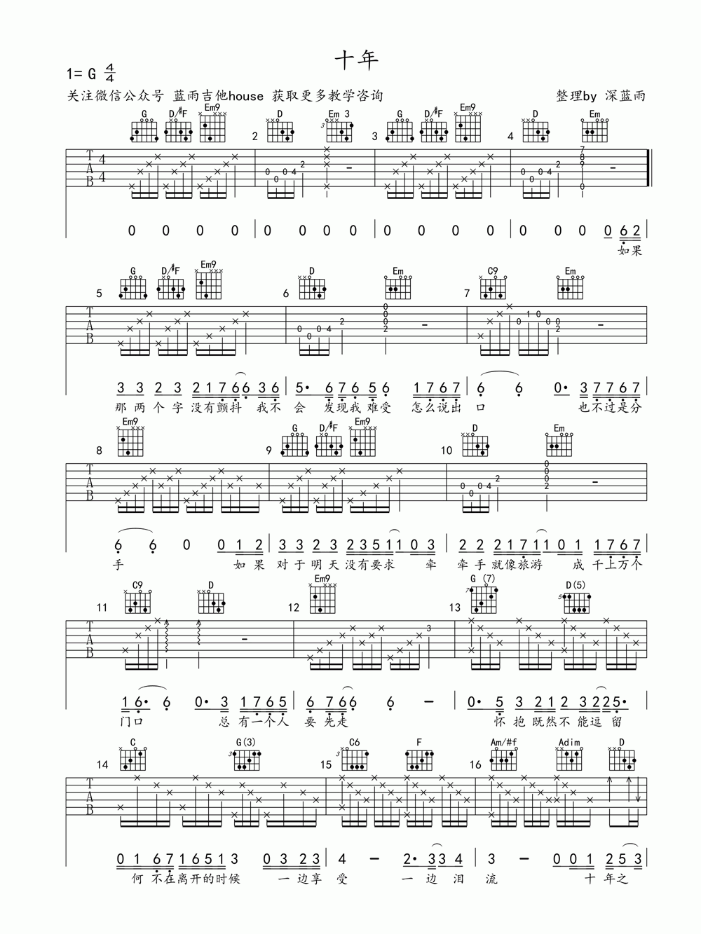 曲谱介绍: 陈奕迅《十年》Eason完美版G调吉他弹唱谱分享,采用G调指法编配,可以根据自己的嗓音来选择变调夹品位。听陈奕迅十年的歌词,我突然有了一种画面感。两人分道扬镳,相爱的人最终爱上了“朋友”,这一版本的音乐是从一本书中截取的,这本书更完美,但不像我想象的那么难,还附有一段吉他演奏和歌唱的示范视频。
