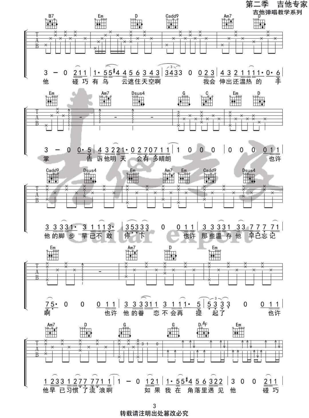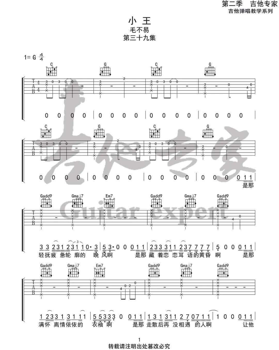 曲谱介绍: 小王吉他谱_毛不易_《小王》G调原版弹唱六线谱_高清图片谱分享,《小王》是由毛不易作词作曲并演唱的一首歌,这首歌主题就是写给过去的自己,他总说自己是个普通人,比他有才华的音乐人太多。或许在毛不易眼里有才华的音乐人不少,可常能唱到我自己会莫名跟着流泪的,只有他一个。 此版本的曲谱来源于音艺吉他专家扒谱制谱,这里歌曲采用了G调指法根据原版进行编配,演唱时可根据自己的嗓音情况夹变调夹。这首歌编配难度不大,使用的节奏型及和弦都十分简单,但由于节奏过于分散,所以这首歌在弹唱起来不是那么好把握。 小王吉他谱_毛不易_《小王》G调原版弹唱六线谱_高清图片谱1-2: