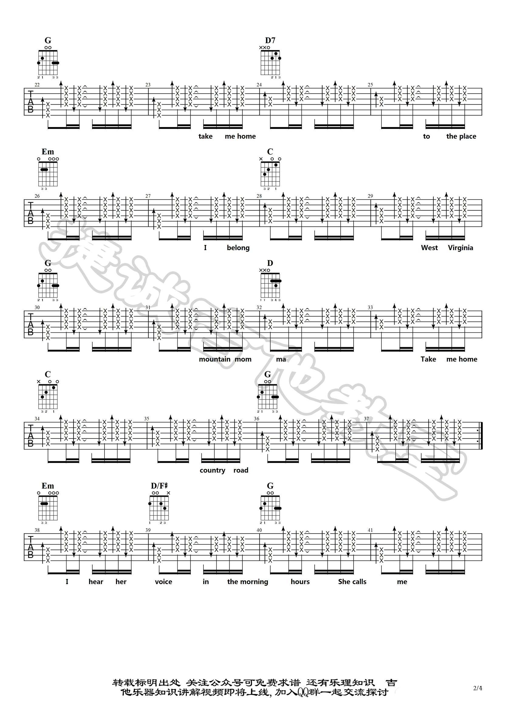 曲谱介绍: 《Take Me Home Country Roads》吉他谱_John Denver_G调弹唱谱_高清六线谱分享,《Take Me Home Country Roads》是由约翰·丹佛演唱的一首歌,属于美国乡村音乐。乡村音乐节奏明快、流畅,有很强的感染力,希望你们也来认识一下John Denver,体验乡村音乐的魅力。这首脍炙人口的歌让中国人爱上了美国的乡村音乐,歌曲旋律轻快,给人描绘了一幅美丽的美国东部西弗吉尼亚田园风光。