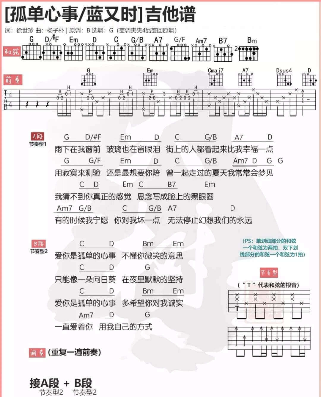 曲谱介绍: 《孤单心事》吉他谱_颜人中/蓝又时_G调简单版弹唱谱_和弦图谱分享,《孤单心事》这首歌原唱为蓝又时在2005年演唱的一首经典情歌,这里的版本为颜人中翻唱的版本,也是非常好听。 此版本的曲谱来源于大树音乐屋扒谱制谱,歌曲原调为B调,这里采用G调指法编配,演唱时夹变调夹4品即可回到原调。歌曲的前奏、左手和弦及右手的参考节奏型都已在谱中给出。 《孤单心事》吉他谱_颜人中/蓝又时_G调简单版弹唱谱_和弦图谱: