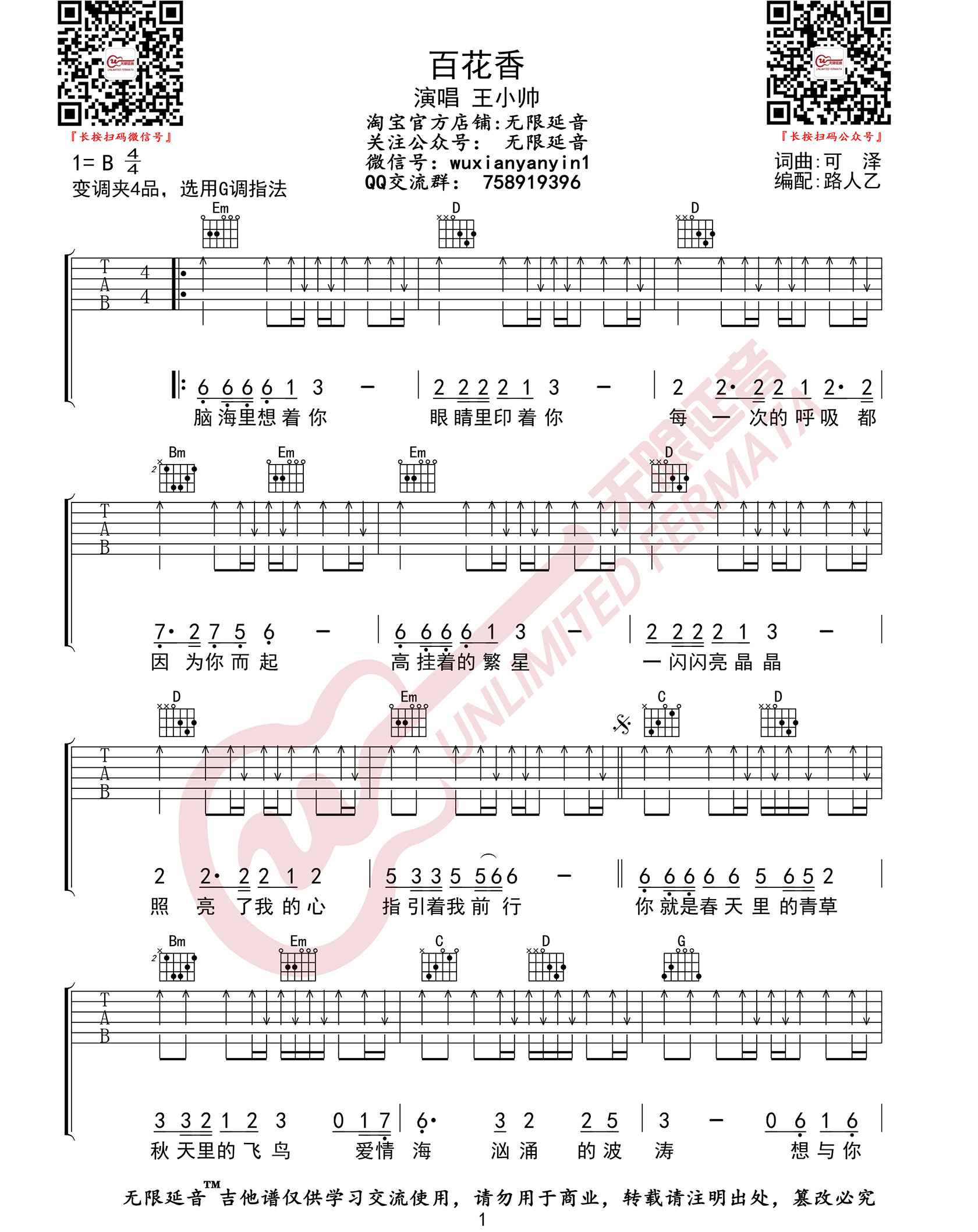 曲谱介绍: 百花香吉他谱_王小帅_《百花香》G调原版弹唱谱_高清六线谱分享,《百花香》是由魏新雨演唱的一首歌,最近网络上王小帅和要不要买菜争相翻唱了这首歌曲,使得这首歌迅速成为火爆网络的神曲,轻快的旋律和节奏让人听起来十分舒服。 此版本的曲谱来源于无限延音扒谱制谱,歌曲原调为B调,这里采用了G调指法根据王小帅演唱原版进行编配,演唱时夹变调夹4品回到原调。歌曲编配难度不大,全曲采用扫弦形式编配,节奏型及和弦都非常简单,比较容易练习。 百花香吉他谱_王小帅_《百花香》G调原版弹唱谱_高清六线谱1: