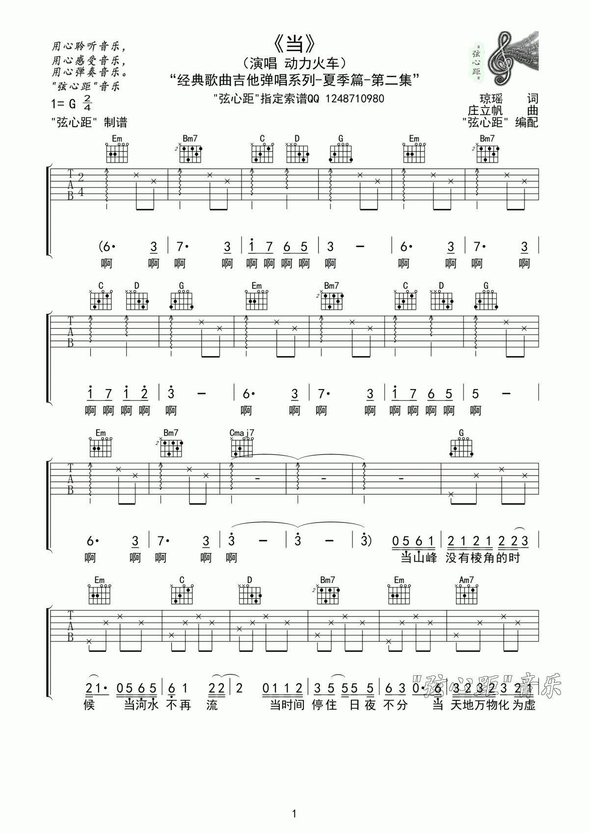 曲谱介绍: 动力火车《当》吉他弹唱谱,采用G调指法编配,共有3张高清图谱。